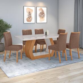 Conjunto Sala de Jantar Mesa de Jantar Easy Tower com 6 Cadeiras Armoni com Vidro Off-White, tecido Couro Morano Avelã. Design Moderno e Acabamento Premium