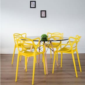 A Mesa Eiffel é queridinha do design e perfeita para quem busca praticidade para sua cozinha, sala de jantar ou área gourmet. Com tampo de MDF colorido e detalhes em madeira e aço ela traz o estilo clássico que amamos. O conjunto com 4 cadeiras Allegra completa o kit e garante o custo benefício para transformar o estilo divertido da sua casa com muita praticidade e toques de design. Conjunto composto por: uma Mesa em MDF com espessura de 18mm com pintura alto brilho e base em madeira faia com detalhes em aço e pintura a pó + 4 cadeiras injetadas em peça única, com quatro pernas de apoio e sapatas incolores, encosto vazado com assento inteiro abaulado, empilhável. Possui Rodízio: Não Altura do Conjunto: 82.5 cm Ambiente: null Ambiente Principal: Sala de Jantar Cor: Amarelo/Preto Informação Complementar: 1x Mesa de Jantar Redonda Eiffel PretoLargura: 120 cmAltura: 75 cmPeso: 17 kgProfundidade: 120 cmNecessita Montagem: Sim1x Conjunto 4 Cadeiras Allegra AmareloLargura: 53 cmAltura: 82,5 cmPeso: 4,25 kgProfundidade: 57,5 cmNecessita Montagem: Não Tamanho: