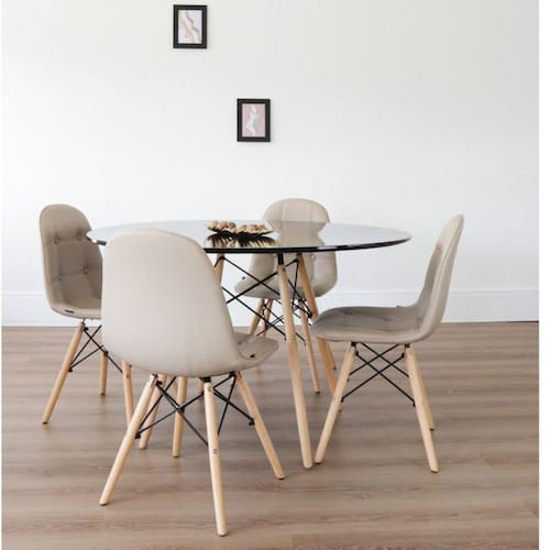 A Mesa Eiffel é queridinha do design e perfeita para quem busca praticidade para sua cozinha, sala de jantar ou área gourmet. Com tampo de MDF colorido e detalhes em madeira e aço ela traz o estilo clássico que amamos. O conjunto com 4 cadeiras Eiffel Botonê completa o kit e garante o custo benefício para transformar o estilo divertido da sua casa com muita praticidade e toques de design. Conjunto composto por: uma Mesa em MDF com espessura de 18mm com pintura alto brilho e base em madeira faia com detalhes em aço e pintura a pó + 4 cadeiras com assento revestido em PU, Base em madeira faia com armação em aço pintado. Possui Rodízio: Não Altura do Conjunto: 82 cm Ambiente: Sala de Jantar Ambiente Principal: Sala de Jantar Cor: Nude Informação Complementar: 1x Mesa de Jantar Redonda Eiffel PretoLargura: 120 cmAltura: 75 cmPeso: 17 kgProfundidade: 120 cmNecessita Montagem: Sim1x Kit 4 Cadeiras Botonê Eiffel NudeLargura: 45Altura: 82Peso: 4.1Profundidade: 50Necessita Montagem: Sim Tamanho: