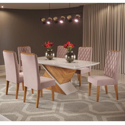 Mesas são indispensáveis para o funcionamento da casa e é no cômodo de confraternização que elas ganham protagonismo. Composto por peças de muito charme, o Conjunto Epic e Iza torna o uso desse móvel importante com 6 cadeiras para garantir uma usabilidade plena para o seu dia a dia. Medida da Mesa (A x L x P): 82 x 180 x 90cm Peso da Mesa: 54,1 kg Mesa suporta até: 50.0000 Acabamento da Cadeira/Banco: Pintura UV Acabamento da Mesa: Pintura UV Acompanha Manual de Instalação: Sim Altura do Conjunto: 98 cm Ambiente Principal: Sala de Jantar Cadeira/Banco estofada: Encosto e Assento Estofados Cadeira/Banco Estofada: Encosto e Assento Estofados Cadeira/Banco suporta até: 90.0000 codigo_ean: 7909903401392 Complexidade da Montagem: Média: pode ser montado por mais de uma pessoa e/ou necessite de maior conhecimento para montagem Cor: Mel/Off White/Rosa Cor do Produto: Mel/Off White/Rosa De Canto (Canto Alemão): Não Enchimento do Assento: Espuma D-20 Enchimento do Encosto: Espuma D-12 Escala de Brilho: Semi-Brilho Espessura do Tampo: 40 mm Estrutura do Assento: MDP/Espuma Estrutura do Encosto: MDP/Espuma Formato do Tampo: Retangular Itens Inclusos: 1 Mesa, 6 Cadeiras, Kit Ferragens e Manual de Montagem Manual de Montagem e Instalação: https://product-hub-prd.madeiramadeira.com.br/865822/documents/3e711aaf-b2a7-445c-892a-af030075b519332mesaauroracomcadeiraiza.pdf Material da Base da Mesa: MDP Material da Estrutura da Cadeira: MDF/MDP Material do Tampo: Vidro/MDF Material Principal: MDF/MDP/Vidro/Tecido Material Principal das Cadeiras/Bancos: MDF/MDP Medida da Cadeira/Banco (A x L x P): 98cm x 42cm x 48cm Medida do Tampo (L x C x E): 180cm x 90cm x 4cm Mesa Dobrável: Não Mesa Extensível: Não Necessita Montagem: Sim Origem do Produto: Nacional Peso da Cadeira/Banco: 8 kg Possui Apoio para Braços: Não Possui Apoio Para os Pés: Não Possui Prateleiras: Não Possui Vidro: Sim Quantidade de Cadeiras: 6 Quantidade de Lugares: 06 Recomendações de Uso, Manutenção e Limpeza: Limpar com pano levemente umedecido com água Revestimento da Cadeira/Banco: Veludo Sistema de Montagem: Parafusos e cavilhas Tipo de Assento: Fixo Tipo de Encosto: Estofado Ean: 7909903401392