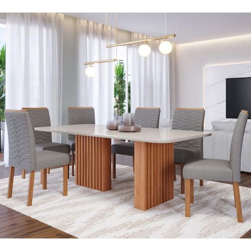 A Mesa Ester é feita em MDF, oferecendo solidez, durabilidade e um acabamento refinado, com um tampo de vidro temperado que combina sofisticação, modernidade e resistência. A base da mesa tem detalhes ripados que acrescentam charme e textura única, tornando-a uma peça singular. A Cadeira Clarice alia elegância, conforto e funcionalidade, com estrutura de madeira que dá durabilidade e um toque rústico. O assento e encosto estofados garantem conforto, e seu sistema de montagem fácil destaca a inovação do design.
