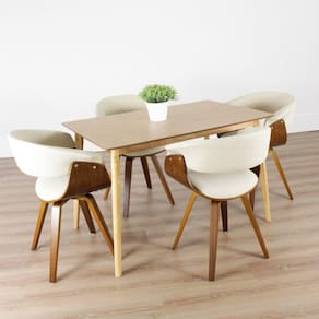 A Mesa Finlândia em madeira é ideal para quem busca elegância e praticidade, seu design rústico garante o detalhe que falta na decoração da sua casa. O conjunto com 4 cadeiras Betina é perfeito para ambientar sua casa com muito aconcheco trazido pelod etalhes em madeira e tecido confortável. Conjunto composto por: uma Mesa com tampo em MDF de 19 mm, base em madeira seringueira + 4 cadeiras em madeira, com assento e encosto estofados em linho ou PU e pés em madeira. Possui Rodízio: Não Altura do Conjunto: 80 cm Ambiente: null Ambiente Principal: Sala de Jantar Cor: Creme Informação Complementar: 4x Cadeira Base Madeira Betina CremeLargura: 62 cmAltura: 80 cmPeso: 8 kgProfundidade: 55 cmNecessita Montagem: Sim1x Mesa de Jantar Retangular Finlândia MarromlLargura: 120 cmAltura: 75 cmPeso: 19 kgNecessita Montagem: Sim Material Principal: MDF Suporta Até (kg): 120 kg Tamanho:
