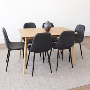 A Mesa Finlândia em madeira é ideal para quem busca elegância e praticidade, seu design rústico garante o detalhe que falta na decoração da sua casa. O conjunto com 6 cadeiras Tania PU completa o kit e garante todo o charme e sofisticação que você procura. Perfeita para criar um ambiente intimista e aconchegante! Conjunto composto por: uma Mesa com tampo em MDF de 19 mm, base em madeira seringueira + 6 Cadeiras fixa com encosto e sem braços, com estrutura do assento em madeira e revestido em poliuretano (PU). Possui pés em metal pintado. Suporta Até (kg): 120 kg Possui Rodízio: Não Altura do Conjunto: 87.5 cm Ambiente: null Ambiente Principal: Sala de Jantar Cor: Preto Informação Complementar: 1x Mesa de Jantar Retangular Finlândia MarromlLargura: 120 cmAltura: 75 cmPeso: 19 kgNecessita Montagem: Sim1x Conjunto 6 Cadeiras Fixa Tania Preto VintageLargura: 43 cmAltura: 87,5 cmPeso: 4,1 kgProfundidade: 50 cmNecessita Montagem: Sim Tamanho: