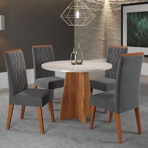 Características: Estrutura da mesa em MDP Tampo redondo em MDF 25mm Tampo suporta até 50kg distribuídos 4 Cadeiras em madeira de Eucalipto Encosto em MDF e espuma D12 Assento em espuma D16 Cada cadeira suporta até 90kg Revestimento das cadeiras em tecido Veludo Acabamento em pintura UV, semi-brilho