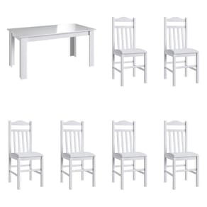 Conjunto Mesa Fixa com 06 Cadeira 300, CJE11500 da Móveis Canção. Conjunto confeccionado em MDP e cadeiras de madeira com estofamento e acabamento em pintura UV, proporcionando beleza, conforto e modernidade para sua sala de jantar. Possui Portas: Não Altura do Conjunto: 96 cm Ambiente: null Ambiente Principal: Sala de Jantar Cor: Branco Informação Complementar: 1x Mesa para Sala de Jantar Fixa 1500x780 Branco Largura: 150 cm Altura: 75 cm Peso: 19,2 kg Profundidade: 78 cm Necessita Montagem: Sim