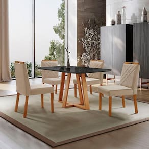 Escala de Brilho: Semi-Brilho Cor Predominante: Mel Encosto e Assento Estofados, Revestidos em Veludo ou Linho Enchimento do Assento: Espuma D-20 Medida da Mesa (A x L x P): 78 X 140 X 80 cm Medida da Base (A x L x P): 75 X 60 X 100 cm Medida do Tampo (L x C x E): 84 X 144 X 2,1 cm Medida da Cadeira/Banco (A x L x P): 94 X 46 X 55 cm Material da Base da Mesa: MDF/Madeira Maciça Tipo de Madeira Maciça da Base da Mesa: Eucalipto Tratado Imunizado e seco em Estufa Peso da Cadeira: 8,5 Kg Cadeira Suporta Até 120 Kg Acabamento da Cadeira: Verniz Natural Material da Estrutura da Cadeira: MDF/Madeira Maciça Cor do Tampo: Preto Cor da Base: Mel Enchimento do Encosto: Espuma D-14 Almofada do Assento: Fixa Estrutura do Assento: MDF 6mm/Espuma 40mm Peso da Mesa: 29 Kg Acabamento da Mesa: Verniz Natural Mesa Suporta Até 30 Kg Formato do Tampo: Retângular Material do Tampo: Vidro 3mm/MDF 18mm