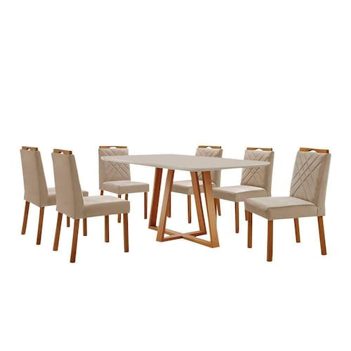 Escala de Brilho: Semi-Brilho Cor Predominante: Mel Encosto e Assento Estofados, Revestidos em Veludo ou Linho Enchimento do Assento: Espuma D-20 Medida da Mesa (A x L x P): 78 X 160 X 90 cm Medida da Base (A x L x P): 75 X 60 X 100 cm Medida do Tampo (L x C x E): 98 X 163 X 2,8 cm Medida da Cadeira/Banco (A x L x P): 94 X 46 X 55 cm Material da Base da Mesa: MDF/Madeira Maciça Tipo de Madeira Maciça da Base da Mesa: Eucalipto Tratado Imunizado e seco em Estufa Peso da Cadeira: 8,5 Kg Cadeira Suporta Até 120 Kg Acabamento da Cadeira: Verniz Natural Material da Estrutura da Cadeira: MDF/Madeira Maciça Cor do Tampo: Off White Cor da Base: Mel Enchimento do Encosto: Espuma D-14 Almofada do Assento: Fixa Estrutura do Assento: MDF 6mm/Espuma 40mm Peso da Mesa: 51,5 Kg Acabamento da Mesa: Verniz Natural Mesa Suporta Até 30 Kg Formato do Tampo: Retângular Material do Tampo: Vidro 3mm/MDF 25mm