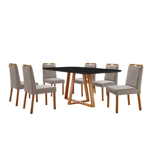 Escala de Brilho: Semi-Brilho Cor Predominante: Mel Encosto e Assento Estofados, Revestidos em Veludo ou Linho Enchimento do Assento: Espuma D-20 Medida da Mesa (A x L x P): 78 X 180 X 90 cm Medida da Base (A x L x P): 75 X 60 X 100 cm Medida do Tampo (L x C x E): 96 X 183 X 2,8 cm Medida da Cadeira/Banco (A x L x P): 94 X 46 X 55 cm Material da Base da Mesa: MDF/Madeira Maciça Tipo de Madeira Maciça da Base da Mesa: Eucalipto Tratado Imunizado e seco em Estufa Peso da Cadeira: 8,5 Kg Cadeira Suporta Até 120 Kg Acabamento da Cadeira: Verniz Natural Material da Estrutura da Cadeira: MDF/Madeira Maciça Cor do Tampo: Preto Cor da Base: Mel Enchimento do Encosto: Espuma D-14 Almofada do Assento: Fixa Estrutura do Assento: MDF 6mm/Espuma 40mm Peso da Mesa: 56,5 Kg Acabamento da Mesa: Verniz Natural Mesa Suporta Até 30 Kg Formato do Tampo: Retângular Material do Tampo: Vidro 3mm/MDF 25mm