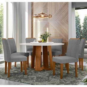 Se você está em busca de mobília que combine elegância, sofisticação e funcionalidade, temos a solução perfeita para você: a Mesa Isabela com tampo giratório, acompanhada de 6 deslumbrantes Cadeiras Amanda.