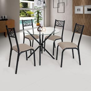 O conjunto de mesa Luna Jade, é o conjunto ideal para sua cozinha, na cor preto fosco e com tampo de Vidro Incolor de 0,90m redondo possui 4 cadeiras com design moderno e anatômico, estofado em courino sintético de fácil limpeza. Acabamento da Cadeira/Banco: Pintura Epóxi Acabamento da Mesa: Pintura Epóxi Ambiente Principal: Cozinha Cadeira/Banco estofada: Sim Cadeira/Banco suporta até: 100 Complexidade da Montagem: Baixa: pode ser montado por uma pessoa sozinha Cor: Preto/Linho Bege Cor do Produto: Preto/Linho Bege Enchimento do Assento: Espuma D-14 Escala de Brilho: Fosco Espessura do Tampo: 8 Estrutura do Assento: Estrutura de madeira pinus compensados, porca agarra metálicas, espuma e courino sintético 20mm Estrutura do Encosto: Aço Itens Inclusos: 1 Mesa, 4 Cadeiras, Kit Ferragens e Manual de Montagem Manual de Montagem e Instalação: https://cdn2.madeiramadeira.com.br/atributo/moveis-ciplafe/1221223-138-e-292.pdf Material da Base da Mesa: Aço Material da Estrutura da Cadeira: Aço Carbono Medida da Cadeira/Banco (A x L x P): 91x37x49cm Medida da Mesa (A x L x P): 74x90x90cm Medida do Tampo (L x C x E): 0,90M Mesa suporta até: 10 Necessita Montagem: Sim Origem do Produto: Nacional Peso da Cadeira/Banco: 3.65 Peso da Mesa: 15.04 Possui Apoio Para os Pés: Não Recomendações de Uso, Manutenção e Limpeza: Limpar com pano levemente umedecido. Não usar produtos abrasivos que possam danificar a superfície do móvel. Revestimento da Cadeira/Banco: Couro Ecológico Sistema de Montagem: Parafuso Vidro Temperado: Não