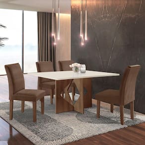 Na hora de receber visitas para refeições em casa você não quer se preocupar com mais nada além do cardápio, certo? Então para ter certeza de que seus convidados se sentirão bem recepcionados invista no Conjunto de Mesa de Jantar Laura, um kit completo e com tudo o que você precisa para um evento perfeito: 4 cadeiras aconchegantes, tampo amplo e um design de encher os olhos. Além do visual moderno, a combinação de cores forma ainda um móvel daqueles dignos de muitos elogios e que será palco para ótimos momentos. Medida da Mesa (A x L x P): 79cmx120cmx80cm Peso da Mesa: 37.8 Mesa suporta até: 30 Acabamento da Cadeira/Banco: Pintura Acabamento da Mesa: Pintura UV Almofada do assento: Fixa Altura do Conjunto: Ambiente Principal: Sala de Jantar Apoio para Braços Estofado: Cadeira/Banco estofada: Encosto e Assento Estofados Cadeira/Banco suporta até: 120 Complexidade da Montagem: Média: pode ser montado por mais de uma pessoa e/ou necessite de maior conhecimento para montagem Cor: Chocolate/Off White/Suede Animale Cor da Base: Cor do Produto: Chocolate/Off White/Suede Animale Cor do Tampo: Bege Cor Flex: Cor Secundária: Bege De Canto (Canto Alemão): Não Design da Base: Enchimento do Assento: Espuma D-23 Enchimento do Encosto: Espuma D-20 Escala de Brilho: Fosco Espessura do Tampo: 15 Estrutura do Assento: MDF Estrutura do Encosto: Formato do Tampo: Retangular Informações Complementares: Itens Inclusos: 1 Mesa, 4 Cadeiras, Kit Ferragens e Manual de Montagem Linha ou Coleção: Manual de Especificação Técnica: Material da Base da Mesa: MDF Material da Estrutura da Cadeira: MDF Material do Tampo: MDF Medida da Base (A x L x P): 76,5cmx60cmx85cm Medida da Cadeira/Banco (A x L x P): 97,5cmx44cmx56cm Medida do Canto Alemão (A x L x P): Medida do Suporte Giratório (L x C x E): Medida do Tampo (L x C x E): 120cmx80cmx1,5cm Mesa Extensível: Não Montagem Flex: Necessita Montagem: Sim Origem do Produto: Nacional Peso da Cadeira/Banco: 9.25 Possui Apoio para Braços: Possui Apoio Para os Pés: Não Possui Suporte Giratório: Não Quantidade de Lugares: 04 Recomendações de Uso, Manutenção e Limpeza: Limpeza com pano macio e levemente umedecido. Não utilizar solventes a base e de inflamáveis. Não utilizar produtos abrasivos. Revestimento da Cadeira/Banco: Suede Sistema de Montagem: Parafusos Tipo de Madeira Maciça da Base da Mesa: Tipo de Madeira Maciça do Tampo: Possui Vidro: Não