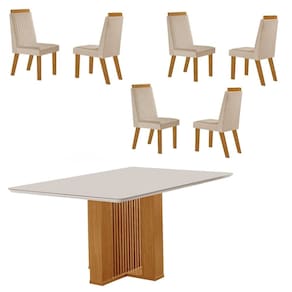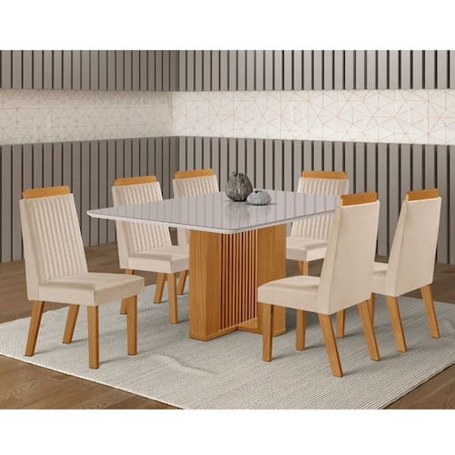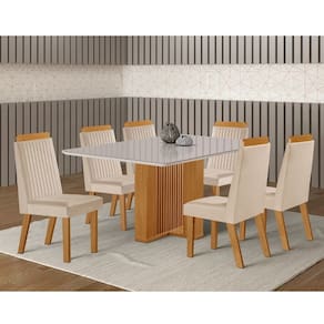 Transforme sua sala de jantar em um ambiente sofisticado e acolhedor com o Conjunto Sala de Jantar Mesa Lisboa com Tampo de Vidro 180cm e 6 Cadeiras em MDF Riviera LJ Móveis. A mesa possui tampo em taburato com vidro temperado de 4mm serigrafado e quinas abauladas, que une beleza e segurança em um design moderno. Acompanhando a mesa, quatro cadeiras com estrutura 100 em MDF, encosto bordado e espuma D20 no assento e D18 no encosto garantem conforto e elegância para suas refeições. Ideal para reunir a família ou receber convidados com estilo.