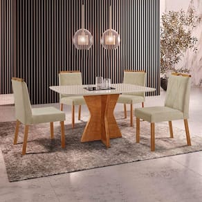 Escala de Brilho: Semi-Brilho Cor Predominante: Mel Encosto e Assento Estofados, Revestidos em Veludo ou Linho Enchimento do Assento: Espuma D-20 Medida da Mesa (A x L x P): 78 X 120 X 80 cm Medida da Base (A x L x P): 75 X 60 X 60 cm Medida do Tampo (L x C x E): 86 X 126 X 2,1 cm Medida da Cadeira/Banco (A x L x P): 94 X 46 X 55 cm Material da Base da Mesa: MDF Peso da Cadeira: 8,5 Kg Cadeira Suporta Até 120 Kg Acabamento da Cadeira: Verniz Natural Material da Estrutura da Cadeira: MDF/Madeira Maciça Cor do Tampo: Off White Cor da Base: Mel Enchimento do Encosto: Espuma D-14 Almofada do Assento: Fixa Estrutura do Assento: MDF 6mm/Espuma 40mm Peso da Mesa: 36 Kg Acabamento da Mesa: Verniz Natural Mesa Suporta Até 30 Kg Formato do Tampo: Retângular Material do Tampo: Vidro 3mm/MDF 18mm