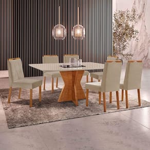 Escala de Brilho: Semi-Brilho Cor Predominante: Mel Encosto e Assento Estofados, Revestidos em Veludo ou Linho Enchimento do Assento: Espuma D-20 Medida da Mesa (A x L x P): 78 X 160 X 90 cm Medida da Base (A x L x P): 75 X 63 X 98 cm Medida do Tampo (L x C x E): 98 X 163 X 2,8 cm Medida da Cadeira/Banco (A x L x P): 94 X 46 X 55 cm Material da Base da Mesa: MDF Peso da Cadeira: 8,5 Kg Cadeira Suporta Até 120 Kg Acabamento da Cadeira: Verniz Natural Material da Estrutura da Cadeira: MDF/Madeira Maciça Cor do Tampo: Off White Cor da Base: Mel Enchimento do Encosto: Espuma D-14 Almofada do Assento: Fixa Estrutura do Assento: MDF 6mm/Espuma 40mm Peso da Mesa: 52 Kg Acabamento da Mesa: Verniz Natural Mesa Suporta Até 30 Kg Formato do Tampo: Retângular Material do Tampo: Vidro 3mm/MDF 25mm