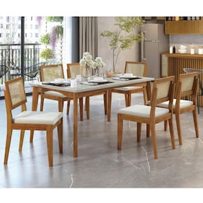 Nossas cadeiras e mesas são produzidas em madeira de eucalipto natural. Sendo madeira maciça possui variações de cores entre as peças de uma mesma cadeira ou mesa, o que demonstra a beleza da natureza. Medida da Mesa (A x L x P): 77cmx160,5cmx90,5cm Peso da Mesa: 52,5 kg Mesa suporta até: 40.0000 Acabamento da Cadeira/Banco: Pintura Acabamento da Mesa: Verniz Ambiente Principal: Sala de Jantar Cadeira/Banco Estofada: Somente Assento Estofado Cadeira/Banco estofada: Somente Assento Estofado Cadeira/Banco suporta até: 100.0000 codigo_ean: 7909903613177 Complexidade da Montagem: Média: pode ser montado por mais de uma pessoa e/ou necessite de maior conhecimento para montagem Cor: Mel Natural/Off White Cor do Produto: Mel Natural/Off White De Canto (Canto Alemão): Não Design da Base: 4 Pés Escala de Brilho: Fosco Espessura do Tampo: 29 mm Estrutura do Assento: Eucalipto Formato do Tampo: Retangular Itens Inclusos: 1 Mesa, 6 Cadeiras, Kit Ferragens e Manual de Montagem Manual de Montagem e Instalação: https://product-hub-prd.madeiramadeira.com.br/898180/documents/8a8da2f1-9f25-41ef-a978-0445d682af7duntomonalisaecadeirarainha.pdf Material da Base da Mesa: Madeira Maciça Material da Estrutura da Cadeira: Madeira Maciça Material do Tampo: Vidro/MDF Medida da Cadeira/Banco (A x L x P): 90cmx48,5cmx56cm Medida do Tampo (L x C x E): 160,5cmx90,5cmx29mm Mesa Extensível: Não Necessita Montagem: Sim Origem do Produto: Nacional Peso da Cadeira/Banco: 9 kg Possui Apoio para Braços: Não Possui Apoio Para os Pés: Não Possui Suporte Giratório: Não Quantidade de Cadeiras: 6 Quantidade de Lugares: 06 Recomendações de Uso, Manutenção e Limpeza: Não utilizar produtos químicos. Não utilizar produtos abrasivos. Não molhar. Utilizar pano macio e seco ou levemente umedecido. Sistema de Montagem: Parafusos. Tipo de Madeira Maciça da Base da Mesa: Eucalipto