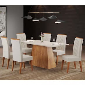 Características: Estrutura da mesa em MDP Tampo retangular em MDP 25mm Tampo suporta até 50kg distribuídos 6 Cadeiras Estrutura da cadeira: madeira de Eucalipto Encosto em MDF e espuma D12 Assento em espuma D20 Cada cadeira suporta até 90kg Revestimento das cadeiras em tecido veludo Acabamento da mesa: pintura UV, semi-brilho