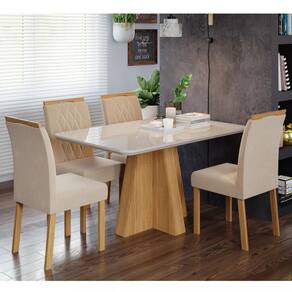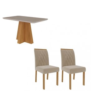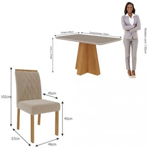 O conjunto Sala de Jantar Maitê, com mesa de 1,30x0,80m e quatro cadeiras Juliana, é ideal para reunir a família em momentos agradáveis. A mesa Maitê destaca-se pela base em formato de cruz e tampo de MDF/vidro com bordas chanfradas e acabamento em laca. Já as cadeiras Juliana combinam elegância e conforto, com estrutura em madeira que adiciona rusticidade e durabilidade. O estofamento de alta qualidade garante conforto, e o sistema de fácil montagem facilita a instalação das cadeiras.