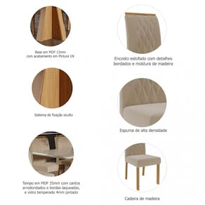 Características Cadeira: Acompanha 4 cadeiras Encosto estofado com detalhes bordados Estrutura em madeira Espuma de alta densidade Suporta até 100kg