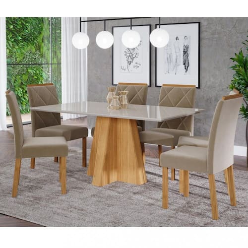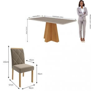 A Sala de Jantar Patricia com 1,60 x 0,80m, acompanhada de 6 cadeiras Fernanda, é ideal para reunir a família em momentos agradáveis e descontraídos. A mesa Patricia tem uma base em formato de cruz, com tampo em MDF/vidro, bordas chanfradas e acabamento em laca. As cadeiras Fernanda combinam elegância, conforto e funcionalidade, com estrutura em madeira para durabilidade e um toque rústico refinado. O assento e encosto são estofados para um conforto excepcional, e o sistema de montagem é prático e inovador.