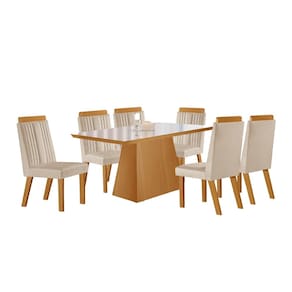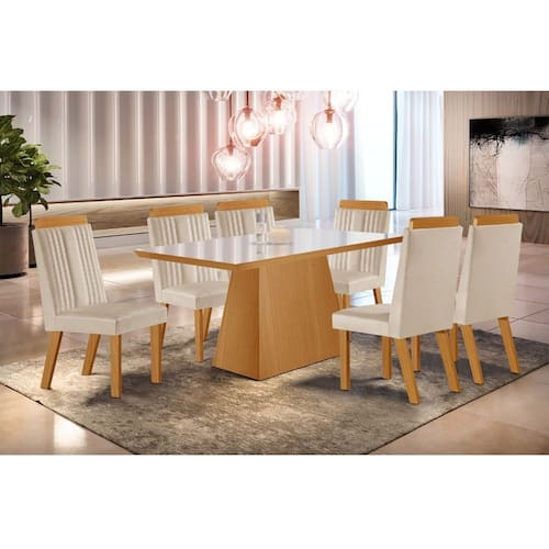 Conjunto Sala de Jantar Mesa Prada com Tampo de Vidro 180cm e 6 Cadeiras em MDF Florenca LJ Moveis, composta por uma mesa de 120cm com tampo de vidro temperado serigrafado de 4mm e acabamento UV, o modelo traz um toque de luxo e sofisticacao ao ambiente. Seu tampo em taburato com quinas abauladas alia elegancia a seguranca no uso diario. As quatro cadeiras bordadas com costuras decorativas oferecem conforto superior gracas a espuma D20 no assento e D18 no encosto, ideais para proporcionar bem-estar nas refeicoes. Fabricadas 100 em MDF com acabamento UV, suportam ate 100kg cada, garantindo resistencia e durabilidade. Um conjunto perfeito para quem busca beleza, aconchego e qualidade para sua sala de jantar.