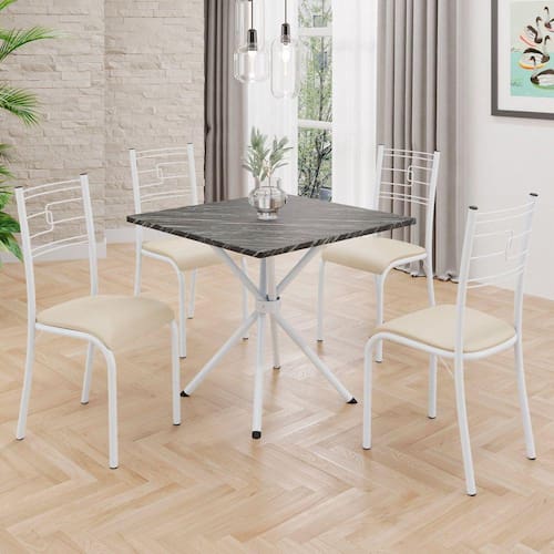 O Conjunto Sala de Jantar Paraty é uma ótima escolha para quem busca combinar estilo e praticidade. Este conjunto apresenta uma mesa quadrada com um design elegante e moderno, acompanhada por quatro cadeiras. A mesa tem uma estrutura em aço, que oferece estabilidade ao conjunto. O tampo em MDP ardósia indiana apresenta uma estética sofisticada e acolhedora. A tonalidade ardósia indiana adiciona calor e elegância ao ambiente, enquanto o tampo MDP oferece durabilidade e resistência a riscos e manchas. Essa combinação de cores naturais e resistência prática resulta em um visual clássico e funcional, tornando o tampo em MDP ardósia indiana uma ótima escolha para aprimorar sua sala de jantar. Medida da Mesa (A x L x P): 75 cm x 70 cm x 70 cm Peso da Mesa: 4,4 kg Mesa suporta até: 15.0000 Acabamento da Cadeira/Banco: Pintura Texturizada Acabamento da Mesa: Pintura Texturizada Ambiente Principal: Sala de Jantar Cadeira/Banco estofada: Somente Assento Estofado Cadeira/Banco Estofada: Somente Assento Estofado Cadeira/Banco suporta até: 120.0000 codigo_ean: 7909903606124 Complexidade da Montagem: Média: pode ser montado por mais de uma pessoa e/ou necessite de maior conhecimento para montagem Cor: Creme / Branco Cor do Produto: Creme / Branco De Canto (Canto Alemão): Não Enchimento do Assento: Espuma D-12 Escala de Brilho: Semi-Fosco Espessura do Tampo: 15 mm Formato do Tampo: Quadrado Itens Inclusos: 1 mesa, 4 cadeiras, manual de montagem e ferragens. Manual de Montagem e Instalação: https://product-hub-prd.madeiramadeira.com.br/896464/documents/2de94915-a8dc-4d4a-8cd9-3d3d06919cf7tagemmesaparatybaseipanema.pdf Material da Base da Mesa: Aço Material da Estrutura da Cadeira: Aço Material do Tampo: MDP Medida da Base (A x L x P): 73,5 cm x 46 cm x 46 cm Medida da Cadeira/Banco (A x L x P): 90 cm x 36,4 cm x 46 cm Medida do Tampo (L x C x E): 70 cm x 70 cm x 1,5 cm Mesa Extensível: Não Necessita Montagem: Sim Origem do Produto: Nacional Peso da Cadeira/Banco: 2,38 kg Possui Apoio Para os Pés: Não Quantidade de Cadeiras: 4 Quantidade de Lugares: 04 Recomendações de Uso, Manutenção e Limpeza: Limpe a superfície usando um pano úmido com a solução(75%água + 15%detergente neutro), torça para retirar o excesso e, em seguida, finalize com um pano limpo e seco. Revestimento da Cadeira/Banco: Courino Sistema de Montagem: PARAFUSOS