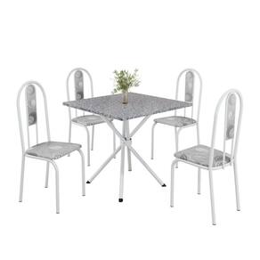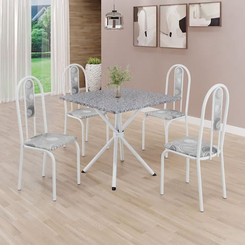 Este conjunto de mesa quadrada e 4 cadeiras oferece estilo e praticidade. Com estrutura tubular em aço para estabilidade, o tampo em pedra granito adiciona sofisticação e resistência a riscos e manchas. As cadeiras combinam harmoniosamente com a mesa, garantindo conforto com estofamento. Ideal para diversos espaços, é perfeito para receber convidados ou desfrutar de refeições em família, criando um ambiente acolhedor e elegante. Medida da Mesa (A x L x P): 75,3 cm x 75 cm x 75 cm Peso da Mesa: 32.9 Mesa suporta até: 15 Acabamento da Cadeira/Banco: Pintura Texturizada Acabamento da Mesa: Pintura Texturizada Ambiente Principal: Sala de Jantar Cadeira/Banco estofada: Encosto e Assento Estofados Cadeira/Banco suporta até: 120 kg Complexidade da Montagem: Média: pode ser montado por mais de uma pessoa e/ou necessite de maior conhecimento para montagem Cor: Paraopeba/Branco Cor do Produto: Paraopeba/Branco Cor Secundária: Cinza De Canto (Canto Alemão): Não Enchimento do Assento: Espuma D-12 Escala de Brilho: Semi-Fosco Espessura do Tampo: 18 Estrutura do Assento: MDP de 15mm, espuma 1,2mm, courino. Formato do Tampo: Quadrado Itens Inclusos: 1 Mesa, 4 Cadeiras, Manual de Montagem e Ferragens. Manual de Montagem e Instalação: https://product-hub-prd.madeiramadeira.com.br/906017/documents/c4b5d539-30db-490d-869d-c63363db342a1944651524617153694628331.pdf Material da Base da Mesa: Aço Material da Estrutura da Cadeira: Aço Material do Tampo: Granito Medida da Cadeira/Banco (A x L x P): 92X cm x 37,5X cm x 45,5X cm Medida do Tampo (L x C x E): 75 cm x 75 cm x 1,8 cm Mesa Extensível: Não Necessita Montagem: Sim Origem do Produto: Nacional Peso da Cadeira/Banco: 3,36 kg Possui Apoio Para os Pés: Não Quantidade de Lugares: 04 Recomendações de Uso, Manutenção e Limpeza: Usar um pano de tecido macio e seco, evitar detergentes, alvejantes e produtos químicos de limpeza; no tampo usar tecido macio levemente umedecido. Revestimento da Cadeira/Banco: Courino Sistema de Montagem: PARAFUSOS