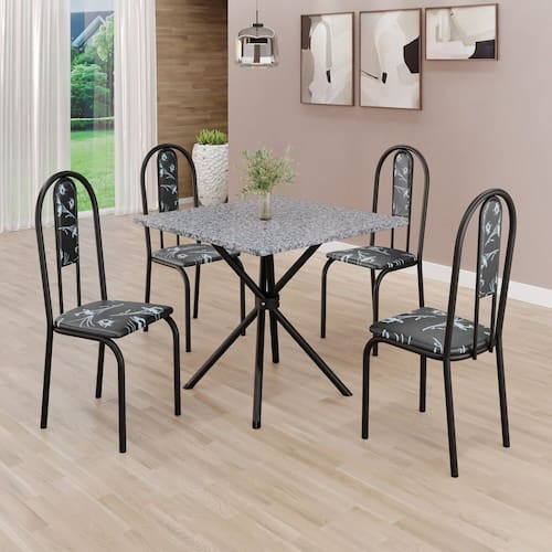 Este conjunto de mesa quadrada e 4 cadeiras oferece estilo e praticidade. Com estrutura tubular em aço para estabilidade, o tampo em pedra granito adiciona sofisticação e resistência a riscos e manchas. As cadeiras combinam harmoniosamente com a mesa, garantindo conforto com estofamento. Ideal para diversos espaços, é perfeito para receber convidados ou desfrutar de refeições em família, criando um ambiente acolhedor e elegante. Medida da Mesa (A x L x P): 75,3 cm x 75 cm x 75 cm Peso da Mesa: 32.9 Mesa suporta até: 15 Acabamento da Cadeira/Banco: Pintura Texturizada Acabamento da Mesa: Pintura Texturizada Ambiente Principal: Sala de Jantar Cadeira/Banco estofada: Encosto e Assento Estofados Cadeira/Banco suporta até: 120 kg Complexidade da Montagem: Média: pode ser montado por mais de uma pessoa e/ou necessite de maior conhecimento para montagem Cor: Preto Floral/Preto Fosco Cor do Produto: Preto Floral/Preto Fosco Cor Secundária: Preto De Canto (Canto Alemão): Não Enchimento do Assento: Espuma D-12 Escala de Brilho: Semi-Fosco Espessura do Tampo: 18 Estrutura do Assento: MDP de 15mm, espuma 1,2mm, courino. Formato do Tampo: Quadrado Itens Inclusos: 1 Mesa, 4 Cadeiras, Manual de Montagem e Ferragens. Manual de Montagem e Instalação: https://product-hub-prd.madeiramadeira.com.br/905959/documents/a2a42746-2e10-4015-b383-778b83f0af761944601524617153686957973.pdf Material da Base da Mesa: Aço Material da Estrutura da Cadeira: Aço Material do Tampo: Granito Medida da Cadeira/Banco (A x L x P): 92X cm x 37,5X cm x 45,5X cm Medida do Tampo (L x C x E): 75 cm x 75 cm x 1,8 cm Mesa Extensível: Não Necessita Montagem: Sim Origem do Produto: Nacional Peso da Cadeira/Banco: 3,36 kg Possui Apoio Para os Pés: Não Quantidade de Lugares: 04 Recomendações de Uso, Manutenção e Limpeza: Usar um pano de tecido macio e seco, evitar detergentes, alvejantes e produtos químicos de limpeza; no tampo usar tecido macio levemente umedecido. Revestimento da Cadeira/Banco: Courino Sistema de Montagem: PARAFUSOS