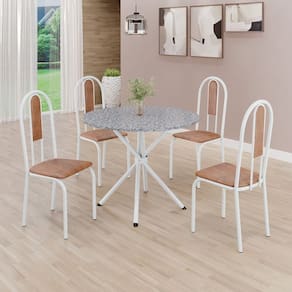 Este conjunto de mesa redonda e 4 cadeiras oferece estilo e praticidade. Com estrutura tubular em aço para estabilidade, o tampo em pedra granito adiciona sofisticação e resistência a riscos e manchas. As cadeiras combinam harmoniosamente com a mesa, garantindo conforto com estofamento. Ideal para diversos espaços, é perfeito para receber convidados ou desfrutar de refeições em família, criando um ambiente acolhedor e elegante. Medida da Mesa (A x L x P): 75,3 cm x 75 cm x 75 cm Peso da Mesa: 27.93 Mesa suporta até: 15 Acabamento da Cadeira/Banco: Pintura Texturizada Acabamento da Mesa: Pintura Texturizada Ambiente Principal: Sala de Jantar Cadeira/Banco estofada: Encosto e Assento Estofados Cadeira/Banco suporta até: 120 kg Complexidade da Montagem: Média: pode ser montado por mais de uma pessoa e/ou necessite de maior conhecimento para montagem Cor: Marrom/Branco Cor do Produto: Marrom/Branco Cor Secundária: Marrom De Canto (Canto Alemão): Não Enchimento do Assento: Espuma D-12 Escala de Brilho: Semi-Fosco Espessura do Tampo: 18 Estrutura do Assento: MDP de 15mm, espuma 1,2mm, courino. Formato do Tampo: Redondo Itens Inclusos: 1 Mesa, 4 Cadeiras, Manual de Montagem e Ferragens. Manual de Montagem e Instalação: https://product-hub-prd.madeiramadeira.com.br/906038/documents/d7bf56a4-f6ec-4863-a379-15529be2438e1944865524617153715633759.pdf Material da Base da Mesa: Aço Material da Estrutura da Cadeira: Aço Material do Tampo: Granito Medida da Cadeira/Banco (A x L x P): 92X cm x 37,5X cm x 45,5X cm Medida do Tampo (L x C x E): 75 cm x 75 cm x 1,8 cm Mesa Extensível: Não Necessita Montagem: Sim Origem do Produto: Nacional Peso da Cadeira/Banco: 3,36 kg Possui Apoio Para os Pés: Não Quantidade de Lugares: 04 Recomendações de Uso, Manutenção e Limpeza: Usar um pano de tecido macio e seco, evitar detergentes, alvejantes e produtos químicos de limpeza; no tampo usar tecido macio levemente umedecido. Revestimento da Cadeira/Banco: Courino Sistema de Montagem: PARAFUSOS