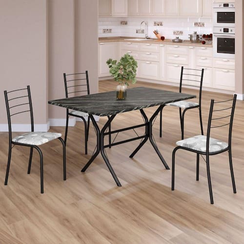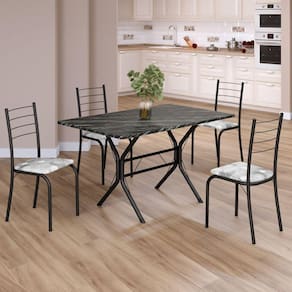 O Conjunto Sala de Jantar Rio é uma ótima escolha para quem busca combinar estilo e praticidade. Este conjunto apresenta uma mesa Retangular com um design elegante e moderno, acompanhada por quatro cadeiras. A mesa tem uma estrutura em aço, que oferece estabilidade ao conjunto. O tampo em pedra ardósia indiana apresenta uma estética sofisticada e acolhedora. A tonalidade indiana adiciona calor e elegância ao ambiente, enquanto a pedra ardósia oferece durabilidade e resistência a riscos e manchas. Essa combinação de cores naturais e resistência prática resulta em um visual clássico e funcional, tornando o tampo em pedra ardósia indiana uma ótima escolha para aprimorar sua sala de jantar. Medida da Mesa (A x L x P): 75,8 cm x 100 cm x 60 cm Peso da Mesa: 29,02 kg Mesa suporta até: 15 kg Acabamento da Cadeira/Banco: Pintura Texturizada Acabamento da Mesa: Pintura Texturizada Ambiente Principal: Sala de Jantar Cadeira/Banco estofada: Somente Assento Estofado Cadeira/Banco suporta até: 120 kg Complexidade da Montagem: Média: pode ser montado por mais de uma pessoa e/ou necessite de maior conhecimento para montagem Cor: Paraopeba/ Preto Fosco Cor do Produto: Paraopeba/ Preto Fosco Cor Secundária: Cinza De Canto (Canto Alemão): Não Escala de Brilho: Semi-Fosco Espessura do Tampo: 18 mm Estrutura do Assento: MDP de 15mm, espuma 1,2mm, courino. Formato do Tampo: Retangular Itens Inclusos: 1 Mesa, 4 Cadeiras, Manual de Montagem e Ferragens Manual de Montagem e Instalação: https://product-hub-prd.madeiramadeira.com.br/897561/documents/e7bcd1f9-5e3e-4c9f-94f3-af4b60c9910e1837585cjriocabofrio.pdf Material da Base da Mesa: Aço Material da Estrutura da Cadeira: Aço Material do Tampo: Ardósia Medida da Base (A x L x P): 74 cm x 58,9 cm x 70 cm Medida da Cadeira/Banco (A x L x P): 84,5 cm x 37,5 cm x 41,5 cm Medida do Tampo (L x C x E): 60 cm x 100 cm x 1,8 cm Mesa Extensível: Não Necessita Montagem: Sim Origem do Produto: Nacional Peso da Cadeira/Banco: 2,48 kg Possui Apoio Para os Pés: Não Quantidade de Lugares: 04 Recomendações de Uso, Manutenção e Limpeza: Limpe a superfície usando um pano úmido com a solução(75%água + 15%detergente neutro), torça para retirar o excesso e, em seguida, finalize com um pano limpo e seco. Sistema de Montagem: Parafusos