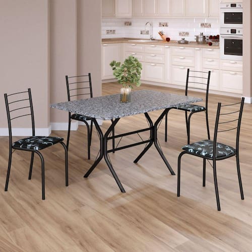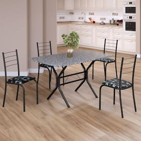 O Conjunto Sala de Jantar Rio é uma ótima escolha para quem busca combinar estilo e praticidade. Este conjunto apresenta uma mesa Retangular com um design elegante e moderno, acompanhada por quatro cadeiras. A mesa tem uma estrutura em aço, que oferece estabilidade ao conjunto. O tampo em pedra granito ocre apresenta uma estética sofisticada e acolhedora. A tonalidade ocre adiciona calor e elegância ao ambiente, enquanto a pedra granito oferece durabilidade e resistência a riscos e manchas. Essa combinação de cores naturais e resistência prática resulta em um visual clássico e funcional, tornando o tampo em pedra granito ocre uma ótima escolha para aprimorar sua sala de jantar. Medida da Mesa (A x L x P): 75,8 cm x 100 cm x 60 cm Peso da Mesa: 35,7 kg Mesa suporta até: 15 kg Acabamento da Cadeira/Banco: Pintura Texturizada Acabamento da Mesa: Pintura Texturizada Ambiente Principal: Sala de Jantar Cadeira/Banco estofada: Somente Assento Estofado Cadeira/Banco suporta até: 120 kg Complexidade da Montagem: Média: pode ser montado por mais de uma pessoa e/ou necessite de maior conhecimento para montagem Cor: Preto Floral / Preto Fosco Cor do Produto: Preto Floral / Preto Fosco Cor Secundária: Preto De Canto (Canto Alemão): Não Escala de Brilho: Semi-Fosco Espessura do Tampo: 18 mm Estrutura do Assento: MDP de 15mm, espuma 1,2mm, courino. Formato do Tampo: Retangular Itens Inclusos: 1 Mesa, 4 Cadeiras, Manual de Montagem e Ferragens Manual de Montagem e Instalação: https://product-hub-prd.madeiramadeira.com.br/897488/documents/ca07b9ba-fe59-4ae3-8e15-987f3ee5c3b21837585cjriocabofrio.pdf Material da Base da Mesa: Aço Material da Estrutura da Cadeira: Aço Material do Tampo: Granito Medida da Base (A x L x P): 74 cm x 58,9 cm x 70 cm Medida da Cadeira/Banco (A x L x P): 84,5 cm x 37,5 cm x 41,5 cm Medida do Tampo (L x C x E): 60 cm x 100 cm x 1,8 cm Mesa Extensível: Não Necessita Montagem: Sim Origem do Produto: Nacional Peso da Cadeira/Banco: 2,48 kg Possui Apoio Para os Pés: Não Quantidade de Lugares: 04 Recomendações de Uso, Manutenção e Limpeza: Limpe a superfície usando um pano úmido com a solução(75%água + 15%detergente neutro), torça para retirar o excesso e, em seguida, finalize com um pano limpo e seco. Sistema de Montagem: Parafusos