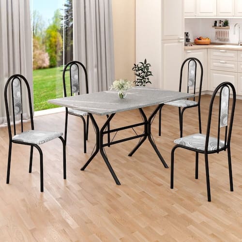 Este conjunto de mesa retangular e 4 cadeiras oferece estilo e praticidade. Com estrutura tubular em aço para estabilidade, o tampo em pedra granito adiciona sofisticação e resistência a riscos e manchas. As cadeiras combinam harmoniosamente com a mesa, garantindo conforto com estofamento. Ideal para diversos espaços, é perfeito para receber convidados ou desfrutar de refeições em família, criando um ambiente acolhedor e elegante. Medida da Mesa (A x L x P): 75,8 cm x 100 cm x 60 cm Peso da Mesa: 36.3 Mesa suporta até: 15 Acabamento da Cadeira/Banco: Pintura Texturizada Acabamento da Mesa: Polido Ambiente Principal: Sala de Jantar Cadeira/Banco estofada: Encosto e Assento Estofados Cadeira/Banco suporta até: 120 kg Complexidade da Montagem: Média: pode ser montado por mais de uma pessoa e/ou necessite de maior conhecimento para montagem Cor: Paraopeba/ Preto Fosco Cor do Produto: Paraopeba/ Preto Fosco Cor Secundária: Cinza De Canto (Canto Alemão): Não Enchimento do Assento: Espuma D-12 Escala de Brilho: Semi-Fosco Espessura do Tampo: 18 Estrutura do Assento: MDP de 15mm, espuma 1,2mm, courino. Formato do Tampo: Retangular Itens Inclusos: 1 Mesa, 4 Cadeiras, Manual de Montagem e Ferragens. Manual de Montagem e Instalação: https://product-hub-prd.madeiramadeira.com.br/905335/documents/dd360633-b500-4fa8-9163-748c728232d01941557524617153381074067.pdf Material da Base da Mesa: Aço Material da Estrutura da Cadeira: Aço Material do Tampo: Granito Medida da Cadeira/Banco (A x L x P): 92X cm x 37,5X cm x 45,5X cm Medida do Tampo (L x C x E): 60 cm x 100 cm x 1,8 cm Mesa Extensível: Não Necessita Montagem: Sim Origem do Produto: Nacional Peso da Cadeira/Banco: 3,36 kg Possui Apoio Para os Pés: Não Quantidade de Lugares: 04 Recomendações de Uso, Manutenção e Limpeza: Usar um pano de tecido macio e seco, evitar detergentes, alvejantes e produtos químicos de limpeza; no tampo usar tecido macio levemente umedecido. Revestimento da Cadeira/Banco: Courino Sistema de Montagem: PARAFUSOS