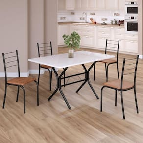 O Conjunto Sala de Jantar Rio é uma ótima escolha para quem busca combinar estilo e praticidade. Este conjunto apresenta uma mesa Retangular com um design elegante e moderno, acompanhada por quatro cadeiras. A mesa tem uma estrutura em aço, que oferece estabilidade ao conjunto. O tampo em Madeira MDP Off White apresenta uma estética sofisticada e acolhedora. A tonalidade Off White adiciona calor e elegância ao ambiente, enquanto a Madeira MDP oferece durabilidade e resistência a riscos e manchas. Essa combinação de cores naturais e resistência prática resulta em um visual clássico e funcional, tornando o tampo em madeira MDP off white uma ótima escolha para aprimorar sua sala de jantar. Medida da Mesa (A x L x P): 75,8 cm x 100 cm x 60 cm Peso da Mesa: 8,54 kg Mesa suporta até: 15 kg Acabamento da Cadeira/Banco: Pintura Texturizada Acabamento da Mesa: Pintura Texturizada Ambiente Principal: Sala de Jantar Cadeira/Banco estofada: Somente Assento Estofado Cadeira/Banco suporta até: 120 kg Complexidade da Montagem: Média: pode ser montado por mais de uma pessoa e/ou necessite de maior conhecimento para montagem Cor: C. Marrom / Preto Fosco Cor do Produto: C. Marrom / Preto Fosco Cor Secundária: Marrom De Canto (Canto Alemão): Não Escala de Brilho: Semi-Fosco Espessura do Tampo: 15 mm Estrutura do Assento: MDP de 15mm, espuma 1,2mm, courino. Formato do Tampo: Retangular Itens Inclusos: 1 Mesa, 4 Cadeiras, Manual de Montagem e Ferragens Manual de Montagem e Instalação: https://product-hub-prd.madeiramadeira.com.br/897742/documents/70a77e87-b758-41cd-b324-ecae818ac8ed1837585cjriocabofrio.pdf Material da Base da Mesa: Aço Material da Estrutura da Cadeira: Aço Material do Tampo: MDP Medida da Base (A x L x P): 74 cm x 58,9 cm x 70 cm Medida da Cadeira/Banco (A x L x P): 84,5 cm x 37,5 cm x 41,5 cm Medida do Tampo (L x C x E): 60 cm x 100 cm x 1,5 cm Mesa Extensível: Não Necessita Montagem: Sim Origem do Produto: Nacional Peso da Cadeira/Banco: 2,48 kg Possui Apoio Para os Pés: Não Quantidade de Lugares: 04 Recomendações de Uso, Manutenção e Limpeza: Limpe a superfície usando um pano úmido com a solução(75%água + 15%detergente neutro), torça para retirar o excesso e, em seguida, finalize com um pano limpo e seco. Sistema de Montagem: Parafusos