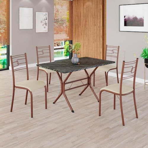 O Conjunto Sala de Jantar Paraty é uma ótima escolha para quem busca combinar estilo e praticidade. Este conjunto apresenta uma mesa retangular com um design elegante e moderno, acompanhada por quatro cadeiras. A mesa tem uma estrutura em aço, que oferece estabilidade ao conjunto. O tampo em madeira MDP ardósia indiana apresenta uma estética sofisticada e acolhedora. A tonalidade ardósia indiana adiciona calor e elegância ao ambiente, enquanto a madeira MDP oferece durabilidade e resistência a riscos e manchas. Essa combinação de cores naturais e resistência prática resulta em um visual clássico e funcional, tornando o tampo em madeira MDP ardósia indiana uma ótima escolha para aprimorar sua sala de jantar. Medida da Mesa (A x L x P): 75,5 cm x 100 cm x 60 cm Peso da Mesa: 9,54 kg Mesa suporta até: 15.0000 Acabamento da Cadeira/Banco: Pintura Texturizada Ambiente Principal: Sala de Jantar Cadeira/Banco Estofada: Somente Assento Estofado Cadeira/Banco estofada: Somente Assento Estofado Cadeira/Banco suporta até: 120.0000 codigo_ean: 7909903589526 Complexidade da Montagem: Média: pode ser montado por mais de uma pessoa e/ou necessite de maior conhecimento para montagem Cor: Creme / Marrom Cor do Produto: Creme / Marrom De Canto (Canto Alemão): Não Escala de Brilho: Semi-Fosco Espessura do Tampo: 18 mm Formato do Tampo: Retangular Itens Inclusos: 1 MESA, 4 CADEIRA, MANUAL DE MONTAGEM E FERRAGENS. Manual de Montagem e Instalação: https://product-hub-prd.madeiramadeira.com.br/894147/documents/6c02e277-00e2-4b57-b410-0f177e2cf495800365cjparatybasecabofrio.pdf Material da Base da Mesa: Aço Material da Estrutura da Cadeira: Aço Material do Tampo: MDP Medida da Cadeira/Banco (A x L x P): 90 cm x 36,4 cm x 46 cm Medida do Tampo (L x C x E): 60 cm x 100 cm x 1,5 cm Mesa Extensível: Não Necessita Montagem: Sim Origem do Produto: Nacional Peso da Cadeira/Banco: 2,38 kg Possui Apoio Para os Pés: Não Quantidade de Cadeiras: 4 Quantidade de Lugares: 04 Recomendações de Uso, Manutenção e Limpeza: Usar um pano de tecido macio e seco, evitar detergentes, alvejantes e produtos químicos de limpeza; no tampo usar tecido macio levemente umedecido. Sistema de Montagem: PARAFUSOS