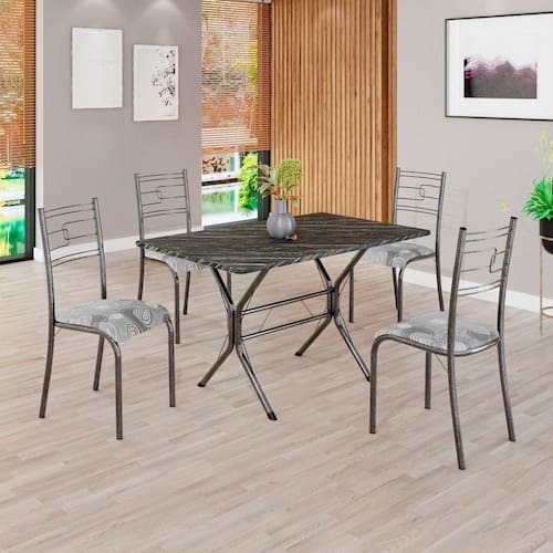 O Conjunto Sala de Jantar Paraty é uma ótima escolha para quem busca combinar estilo e praticidade. Este conjunto apresenta uma mesa retangular com um design elegante e moderno, acompanhada por quatro cadeiras. A mesa tem uma estrutura em aço, que oferece estabilidade ao conjunto. O tampo em pedra ardósia indiana apresenta uma estética sofisticada e acolhedora. A tonalidade indiana adiciona calor e elegância ao ambiente, enquanto a pedra ardósia oferece durabilidade e resistência a riscos e manchas. Essa combinação de cores naturais e resistência prática resulta em um visual clássico e funcional, tornando o tampo em pedra ardósia indiana uma ótima escolha para aprimorar sua sala de jantar. Medida da Mesa (A x L x P): 75,8 cm x 100 cm x 60 cm Peso da Mesa: 32,32 kg Mesa suporta até: 15.0000 Acabamento da Cadeira/Banco: Pintura Texturizada Acabamento da Mesa: Pintura Texturizada Ambiente Principal: Sala de Jantar Cadeira/Banco estofada: Somente Assento Estofado Cadeira/Banco Estofada: Somente Assento Estofado Cadeira/Banco suporta até: 120.0000 codigo_ean: 7909903586716 Complexidade da Montagem: Média: pode ser montado por mais de uma pessoa e/ou necessite de maior conhecimento para montagem Cor: Paraopeba / Mart Prata Cor do Produto: Paraopeba / Mart Prata De Canto (Canto Alemão): Não Escala de Brilho: Semi-Fosco Espessura do Tampo: 18 mm Formato do Tampo: Retangular Itens Inclusos: 1 mesa, 4 cadeiras, manual de montagem e ferragens. Manual de Montagem e Instalação: https://product-hub-prd.madeiramadeira.com.br/893401/documents/acd03aeb-4c0a-41b9-9a2b-e09fc0fe2c03800365cjparatybasecabofrio.pdf Material da Base da Mesa: Aço Material da Estrutura da Cadeira: Aço Material do Tampo: Ardósia Medida da Cadeira/Banco (A x L x P): 90 cm x 36,4 cm x 46 cm Medida do Tampo (L x C x E): 60 cm x 100 cm x 1,8 cm Mesa Extensível: Não Necessita Montagem: Sim Origem do Produto: Nacional Peso da Cadeira/Banco: 2,38 kg Possui Apoio Para os Pés: Não Quantidade de Cadeiras: 4 Quantidade de Lugares: 04 Recomendações de Uso, Manutenção e Limpeza: Usar um pano de tecido macio e seco, evitar detergentes, alvejantes e produtos químicos de limpeza; no tampo usar tecido macio levemente umedecido. Sistema de Montagem: PARAFUSOS