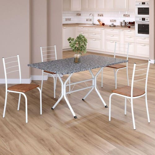 O Conjunto Sala de Jantar Rio é uma ótima escolha para quem busca combinar estilo e praticidade. Este conjunto apresenta uma mesa Retangular com um design elegante e moderno, acompanhada por quatro cadeiras. A mesa tem uma estrutura em aço, que oferece estabilidade ao conjunto. O tampo em pedra granito ocre apresenta uma estética sofisticada e acolhedora. A tonalidade ocre adiciona calor e elegância ao ambiente, enquanto a pedra granito oferece durabilidade e resistência a riscos e manchas. Essa combinação de cores naturais e resistência prática resulta em um visual clássico e funcional, tornando o tampo em pedra granito ocre uma ótima escolha para aprimorar sua sala de jantar. Medida da Mesa (A x L x P): 75,8 cm x 120 cm x 75 cm Peso da Mesa: 49,6 kg Mesa suporta até: 15 kg Acabamento da Cadeira/Banco: Pintura Texturizada Acabamento da Mesa: Pintura Texturizada Ambiente Principal: Sala de Jantar Cadeira/Banco estofada: Somente Assento Estofado Cadeira/Banco suporta até: 120 kg Complexidade da Montagem: Média: pode ser montado por mais de uma pessoa e/ou necessite de maior conhecimento para montagem Cor: C. Marrom / Branco Cor do Produto: C. Marrom / Branco Cor Secundária: Marrom De Canto (Canto Alemão): Não Escala de Brilho: Semi-Fosco Espessura do Tampo: 18 mm Estrutura do Assento: MDP de 15mm, espuma 1,2mm, courino. Formato do Tampo: Retangular Itens Inclusos: 1 Mesa, 4 Cadeiras, Manual de Montagem e Ferragens Manual de Montagem e Instalação: https://product-hub-prd.madeiramadeira.com.br/897869/documents/eb38b625-50d9-4538-88c0-33e69bb41bb41837585cjriocabofrio.pdf Material da Base da Mesa: Aço Material da Estrutura da Cadeira: Aço Material do Tampo: Granito Medida da Base (A x L x P): 74 cm x 65cm x 85,5 cm Medida da Cadeira/Banco (A x L x P): 84,5 cm x 37,5 cm x 41,5 cm Medida do Tampo (L x C x E): 75 cm x 120 cm x 1,8 cm Mesa Extensível: Não Necessita Montagem: Sim Origem do Produto: Nacional Peso da Cadeira/Banco: 2,48 kg Possui Apoio Para os Pés: Não Quantidade de Lugares: 04 Recomendações de Uso, Manutenção e Limpeza: Limpe a superfície usando um pano úmido com a solução(75%água + 15%detergente neutro), torça para retirar o excesso e, em seguida, finalize com um pano limpo e seco. Sistema de Montagem: Parafusos