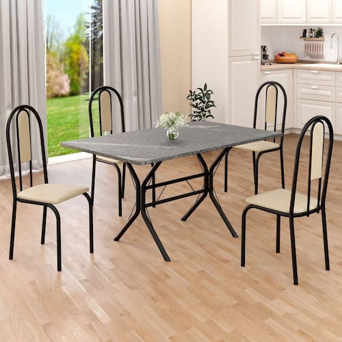 Este conjunto de mesa retangular e 4 cadeiras oferece estilo e praticidade. Com estrutura tubular em aço para estabilidade, o tampo em pedra granito adiciona sofisticação e resistência a riscos e manchas. As cadeiras combinam harmoniosamente com a mesa, garantindo conforto com estofamento. Ideal para diversos espaços, é perfeito para receber convidados ou desfrutar de refeições em família, criando um ambiente acolhedor e elegante. Medida da Mesa (A x L x P): 75,8 cm x 120 cm x 75 cm Peso da Mesa: 55.16 Mesa suporta até: 15 Acabamento da Cadeira/Banco: Pintura Texturizada Acabamento da Mesa: Polido Ambiente Principal: Sala de Jantar Cadeira/Banco estofada: Encosto e Assento Estofados Cadeira/Banco suporta até: 120 kg Complexidade da Montagem: Média: pode ser montado por mais de uma pessoa e/ou necessite de maior conhecimento para montagem Cor: Creme/Preto Fosco Cor do Produto: Creme/Preto Fosco Cor Secundária: Bege De Canto (Canto Alemão): Não Enchimento do Assento: Espuma D-12 Escala de Brilho: Semi-Fosco Espessura do Tampo: 18 Estrutura do Assento: MDP de 15mm, espuma 1,2mm, courino. Formato do Tampo: Retangular Itens Inclusos: 1 Mesa, 4 Cadeiras, Manual de Montagem e Ferragens. Manual de Montagem e Instalação: https://product-hub-prd.madeiramadeira.com.br/905406/documents/3c7618c7-9cb6-40b7-a62e-48f07840695e1942651524617153497884636.pdf Material da Base da Mesa: Aço Material da Estrutura da Cadeira: Aço Material do Tampo: Granito Medida da Cadeira/Banco (A x L x P): 92X cm x 37,5X cm x 45,5X cm Medida do Tampo (L x C x E): 75 cm x 120 cm x 1,8 cm Mesa Extensível: Não Necessita Montagem: Sim Origem do Produto: Nacional Peso da Cadeira/Banco: 3,36 kg Possui Apoio Para os Pés: Não Quantidade de Lugares: 04 Recomendações de Uso, Manutenção e Limpeza: Usar um pano de tecido macio e seco, evitar detergentes, alvejantes e produtos químicos de limpeza; no tampo usar tecido macio levemente umedecido. Revestimento da Cadeira/Banco: Courino Sistema de Montagem: PARAFUSOS