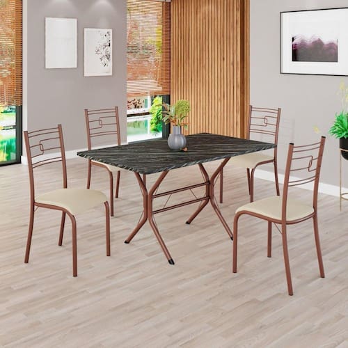 O Conjunto Sala de Jantar Paraty é uma ótima escolha para quem busca combinar estilo e praticidade. Este conjunto apresenta uma mesa retangular com um design elegante e moderno, acompanhada por quatro cadeiras. A mesa tem uma estrutura em aço, que oferece estabilidade ao conjunto. O tampo em madeira MDP ardósia indiana apresenta uma estética sofisticada e acolhedora. A tonalidade ardósia indiana adiciona calor e elegância ao ambiente, enquanto a madeira MDP oferece durabilidade e resistência a riscos e manchas. Essa combinação de cores naturais e resistência prática resulta em um visual clássico e funcional, tornando o tampo em madeira MDP off white uma ótima escolha para aprimorar sua sala de jantar. Medida da Mesa (A x L x P): 75,5 cm x 120 cm x 75 cm Peso da Mesa: 12,25 kg Mesa suporta até: 15.0000 Acabamento da Cadeira/Banco: Pintura Texturizada Ambiente Principal: Sala de Jantar Cadeira/Banco Estofada: Somente Assento Estofado Cadeira/Banco estofada: Somente Assento Estofado Cadeira/Banco suporta até: 120.0000 codigo_ean: 7909903589700 Complexidade da Montagem: Média: pode ser montado por mais de uma pessoa e/ou necessite de maior conhecimento para montagem Cor: Creme / Marrom Cor do Produto: Creme / Marrom De Canto (Canto Alemão): Não Escala de Brilho: Semi-Fosco Espessura do Tampo: 18 mm Formato do Tampo: Retangular Itens Inclusos: 1 mesa, 4 cadeiras, manual de montagem e ferragens. Manual de Montagem e Instalação: https://product-hub-prd.madeiramadeira.com.br/894167/documents/bcd3242d-87bf-486b-828f-9a4838167e2d800365cjparatybasecabofrio.pdf Material da Base da Mesa: Aço Material da Estrutura da Cadeira: Aço Material do Tampo: MDP Medida da Cadeira/Banco (A x L x P): 90 cm x 36,4 cm x 46 cm Medida do Tampo (L x C x E): 75 cm x 120 cm x 1,5 cm Mesa Extensível: Não Necessita Montagem: Sim Origem do Produto: Nacional Peso da Cadeira/Banco: 2,38 kg Possui Apoio Para os Pés: Não Quantidade de Cadeiras: 4 Quantidade de Lugares: 04 Recomendações de Uso, Manutenção e Limpeza: Usar um pano de tecido macio e seco, evitar detergentes, alvejantes e produtos químicos de limpeza; no tampo usar tecido macio levemente umedecido. Sistema de Montagem: Parafusos