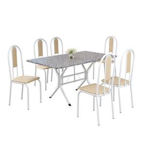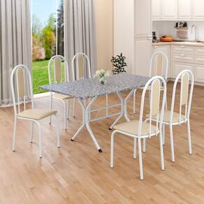 Este conjunto de mesa retangular e 6 cadeiras oferece estilo e praticidade. Com estrutura tubular em aço para estabilidade, o tampo em pedra granito adiciona sofisticação e resistência a riscos e manchas. As cadeiras combinam harmoniosamente com a mesa, garantindo conforto com estofamento. Ideal para diversos espaços, é perfeito para receber convidados ou desfrutar de refeições em família, criando um ambiente acolhedor e elegante. Medida da Mesa (A x L x P): 75,8 cm x 140 cm x 75 cm Peso da Mesa: 60 Mesa suporta até: 15 Acabamento da Cadeira/Banco: Pintura Texturizada Acabamento da Mesa: Polido Ambiente Principal: Sala de Jantar Cadeira/Banco estofada: Encosto e Assento Estofados Cadeira/Banco suporta até: 120 kg Complexidade da Montagem: Média: pode ser montado por mais de uma pessoa e/ou necessite de maior conhecimento para montagem Cor: Creme/Branco Cor do Produto: Creme/Branco Cor Secundária: Bege De Canto (Canto Alemão): Não Enchimento do Assento: Espuma D-12 Escala de Brilho: Semi-Fosco Espessura do Tampo: 18 Estrutura do Assento: MDP de 15mm, espuma 1,2mm, courino. Formato do Tampo: Retangular Itens Inclusos: 1 Mesa, 6 Cadeiras, Manual de Montagem e Ferragens. Manual de Montagem e Instalação: https://product-hub-prd.madeiramadeira.com.br/905884/documents/d8131134-9db3-4ddb-bf63-ddef0f1d00811943603524617153606933252.pdf Material da Base da Mesa: Aço Material da Estrutura da Cadeira: Aço Material do Tampo: Granito Medida da Cadeira/Banco (A x L x P): 92X cm x 37,5X cm x 45,5X cm Medida do Tampo (L x C x E): 75 cm x 140 cm x 1,8 cm Mesa Extensível: Não Necessita Montagem: Sim Origem do Produto: Nacional Peso da Cadeira/Banco: 3,36 kg Possui Apoio Para os Pés: Não Quantidade de Lugares: 06 Recomendações de Uso, Manutenção e Limpeza: Usar um pano de tecido macio e seco, evitar detergentes, alvejantes e produtos químicos de limpeza; no tampo usar tecido macio levemente umedecido. Revestimento da Cadeira/Banco: Courino Sistema de Montagem: Parafusos