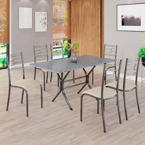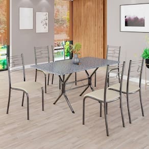 O Conjunto Sala de Jantar Paraty é uma ótima escolha para quem busca combinar estilo e praticidade. Este conjunto apresenta uma mesa retangular com um design elegante e moderno, acompanhada por seis cadeiras. A mesa tem uma estrutura em aço, que oferece estabilidade ao conjunto. O tampo em pedra granito ocre apresenta uma estética sofisticada e acolhedora. A tonalidade ocre adiciona calor e elegância ao ambiente, enquanto a pedra granito oferece durabilidade e resistência a riscos e manchas. Essa combinação de cores naturais e resistência prática resulta em um visual clássico e funcional, tornando o tampo em pedra granito ocre uma ótima escolha para aprimorar sua sala de jantar. Medida da Mesa (A x L x P): 75,8 cm x 140 cm x 75 cm Peso da Mesa: 62,2 kg Mesa suporta até: 15.0000 Acabamento da Cadeira/Banco: Pintura Texturizada Acabamento da Mesa: Polido Ambiente Principal: Sala de Jantar Cadeira/Banco estofada: Somente Assento Estofado Cadeira/Banco Estofada: Somente Assento Estofado Cadeira/Banco suporta até: 120.0000 codigo_ean: 7909903582909 Complexidade da Montagem: Média: pode ser montado por mais de uma pessoa e/ou necessite de maior conhecimento para montagem Cor: Creme / Mart Prata Cor do Produto: Creme / Mart Prata De Canto (Canto Alemão): Não Escala de Brilho: Semi-Fosco Espessura do Tampo: 18 mm Formato do Tampo: Retangular Itens Inclusos: 1 mesa, 6 cadeiras, manual de montagem e ferragens. Manual de Montagem e Instalação: https://product-hub-prd.madeiramadeira.com.br/893383/documents/94d45638-f193-41d5-9aac-5c71101059c0800365cjparatybasecabofrio.pdf Material da Base da Mesa: Aço Material da Estrutura da Cadeira: Aço Material do Tampo: Granito Medida da Cadeira/Banco (A x L x P): 90 cm x 36,4 cm x 46 cm Medida do Tampo (L x C x E): 75 cm x 140 cm x 1,8 cm Mesa Extensível: Não Necessita Montagem: Sim Origem do Produto: Nacional Peso da Cadeira/Banco: 2,38 kg Possui Apoio Para os Pés: Não Quantidade de Cadeiras: 6 Quantidade de Lugares: 06 Recomendações de Uso, Manutenção e Limpeza: Usar um pano de tecido macio e seco, evitar detergentes, alvejantes e produtos químicos de limpeza; no tampo usar tecido macio levemente umedecido. Sistema de Montagem: PARAFUSOS