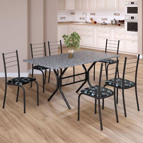 O Conjunto Sala de Jantar Rio é uma ótima escolha para quem busca combinar estilo e praticidade. Este conjunto apresenta uma mesa Retangular com um design elegante e moderno, acompanhada por seis cadeiras. A mesa tem uma estrutura em aço, que oferece estabilidade ao conjunto. O tampo em pedra granito ocre apresenta uma estética sofisticada e acolhedora. A tonalidade ocre adiciona calor e elegância ao ambiente, enquanto a pedra granito oferece durabilidade e resistência a riscos e manchas. Essa combinação de cores naturais e resistência prática resulta em um visual clássico e funcional, tornando o tampo em pedra granito ocre uma ótima escolha para aprimorar sua sala de jantar. Medida da Mesa (A x L x P): 75,8 cm x 140 cm x 75 cm Peso da Mesa: 62,3 kg Mesa suporta até: 15 kg Acabamento da Cadeira/Banco: Pintura Texturizada Acabamento da Mesa: Pintura Texturizada Ambiente Principal: Sala de Jantar Cadeira/Banco estofada: Somente Assento Estofado Cadeira/Banco suporta até: 120 kg Complexidade da Montagem: Média: pode ser montado por mais de uma pessoa e/ou necessite de maior conhecimento para montagem Cor: Preto Floral / Preto Fosco Cor do Produto: Preto Floral / Preto Fosco Cor Secundária: Preto De Canto (Canto Alemão): Não Escala de Brilho: Semi-Fosco Espessura do Tampo: 18 mm Estrutura do Assento: MDP de 15mm, espuma 1,2mm, courino. Formato do Tampo: Retangular Itens Inclusos: 1 Mesa, 6 Cadeiras, Manual de Montagem e Ferragens Manual de Montagem e Instalação: https://product-hub-prd.madeiramadeira.com.br/897526/documents/ff19eb67-80ef-4441-a103-6f1f7822d4ea1837585cjriocabofrio.pdf Material da Base da Mesa: Aço Material da Estrutura da Cadeira: Aço Material do Tampo: Granito Medida da Base (A x L x P): 75,5cm x 65cm x 85,5 cm Medida da Cadeira/Banco (A x L x P): 84,5 cm x 37,5 cm x 41,5 cm Medida do Tampo (L x C x E): 140 cm x 75 cm x 1,8 cm Mesa Extensível: Não Necessita Montagem: Sim Origem do Produto: Nacional Peso da Cadeira/Banco: 2,48 kg Possui Apoio Para os Pés: Não Quantidade de Lugares: 06 Recomendações de Uso, Manutenção e Limpeza: Limpe a superfície usando um pano úmido com a solução(75%água + 15%detergente neutro), torça para retirar o excesso e, em seguida, finalize com um pano limpo e seco. Sistema de Montagem: Parafusos