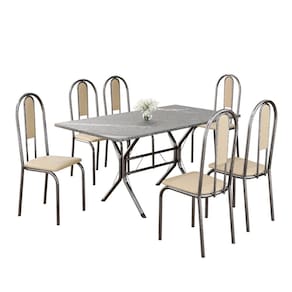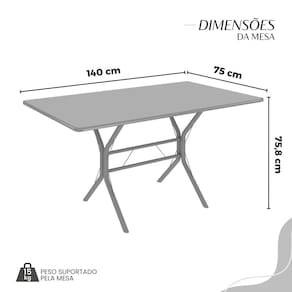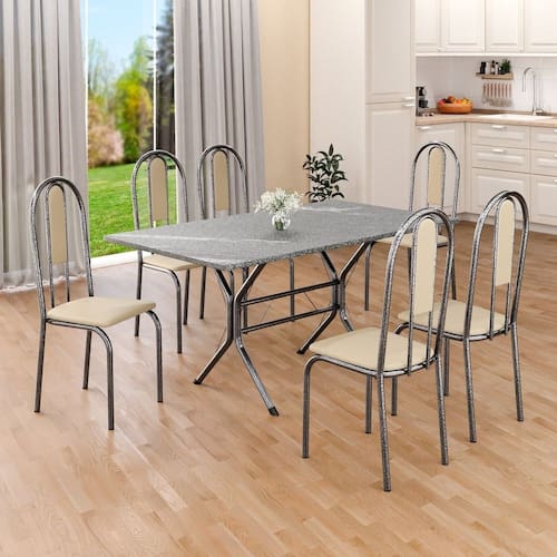 Este conjunto de mesa retangular e 6 cadeiras oferece estilo e praticidade. Com estrutura tubular em aço para estabilidade, o tampo em pedra granito adiciona sofisticação e resistência a riscos e manchas. As cadeiras combinam harmoniosamente com a mesa, garantindo conforto com estofamento. Ideal para diversos espaços, é perfeito para receber convidados ou desfrutar de refeições em família, criando um ambiente acolhedor e elegante. Medida da Mesa (A x L x P): 75,8 cm x 140 cm x 75 cm Peso da Mesa: 57.1 Mesa suporta até: 15 Acabamento da Cadeira/Banco: Pintura Texturizada Acabamento da Mesa: Polido Ambiente Principal: Sala de Jantar Cadeira/Banco estofada: Encosto e Assento Estofados Cadeira/Banco suporta até: 120 kg Complexidade da Montagem: Média: pode ser montado por mais de uma pessoa e/ou necessite de maior conhecimento para montagem Cor: Creme/Prata Cor do Produto: Creme/Prata Cor Secundária: Bege De Canto (Canto Alemão): Não Enchimento do Assento: Espuma D-12 Escala de Brilho: Semi-Fosco Espessura do Tampo: 18 Estrutura do Assento: MDP de 15mm, espuma 1,2mm, courino. Formato do Tampo: Retangular Itens Inclusos: 1 Mesa, 6 Cadeiras, Manual de Montagem e Ferragens. Manual de Montagem e Instalação: https://product-hub-prd.madeiramadeira.com.br/905497/documents/c1888de6-fc14-4eec-ae72-2317c6d0f4721943726524617153620331811.pdf Material da Base da Mesa: Aço Material da Estrutura da Cadeira: Aço Material do Tampo: Granito Medida da Cadeira/Banco (A x L x P): 92X cm x 37,5X cm x 45,5X cm Medida do Tampo (L x C x E): 75 cm x 140 cm x 1,8 cm Mesa Extensível: Não Necessita Montagem: Sim Origem do Produto: Nacional Peso da Cadeira/Banco: 3,36 kg Possui Apoio Para os Pés: Não Quantidade de Lugares: 06 Recomendações de Uso, Manutenção e Limpeza: Usar um pano de tecido macio e seco, evitar detergentes, alvejantes e produtos químicos de limpeza; no tampo usar tecido macio levemente umedecido. Revestimento da Cadeira/Banco: Courino Sistema de Montagem: PARAFUSOS