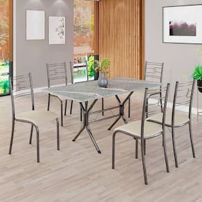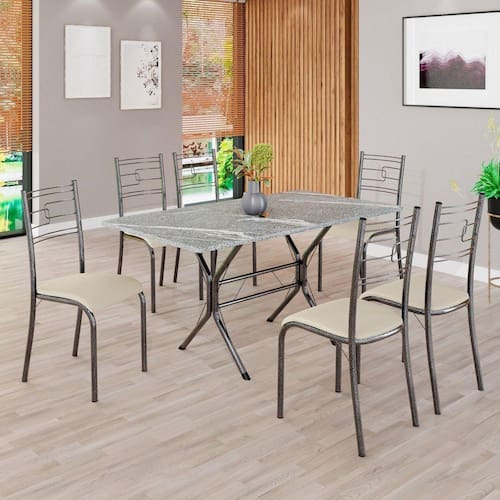 O Conjunto Sala de Jantar Paraty é uma ótima escolha para quem busca combinar estilo e praticidade. Este conjunto apresenta uma mesa retangular com um design elegante e moderno, acompanhada por seis cadeiras. A mesa tem uma estrutura em aço, que oferece estabilidade ao conjunto. O tampo em pedra granito topázio apresenta uma estética sofisticada e acolhedora. A tonalidade topázio adiciona calor e elegância ao ambiente, enquanto a pedra granito oferece durabilidade e resistência a riscos e manchas. Essa combinação de cores naturais e resistência prática resulta em um visual clássico e funcional, tornando o tampo em pedra granito topázio uma ótima escolha para aprimorar sua sala de jantar. Medida da Mesa (A x L x P): 75,8 cm x 140 cm x 75 cm Peso da Mesa: 60,2 kg Mesa suporta até: 15.0000 Acabamento da Cadeira/Banco: Pintura Texturizada Acabamento da Mesa: Polido Ambiente Principal: Sala de Jantar Cadeira/Banco estofada: Somente Assento Estofado Cadeira/Banco Estofada: Somente Assento Estofado Cadeira/Banco suporta até: 120.0000 codigo_ean: 7909903588864 Complexidade da Montagem: Média: pode ser montado por mais de uma pessoa e/ou necessite de maior conhecimento para montagem Cor: Creme / Mart Prata Cor do Produto: Creme / Mart Prata De Canto (Canto Alemão): Não Escala de Brilho: Semi-Fosco Espessura do Tampo: 18 mm Formato do Tampo: Retangular Itens Inclusos: 1 MESA, 6 CADEIRAS, MANUAL DE MONTAGEM E FERRAGENS. Manual de Montagem e Instalação: https://product-hub-prd.madeiramadeira.com.br/894019/documents/6450ebb5-5cbd-416f-9636-b408f0e02f0f800365cjparatybasecabofrio.pdf Material da Base da Mesa: Aço Material da Estrutura da Cadeira: Aço Material do Tampo: Granito Medida da Cadeira/Banco (A x L x P): 90 cm x 36,4 cm x 46 cm Medida do Tampo (L x C x E): 75 cm x 140 cm x 1,8 cm Mesa Extensível: Não Necessita Montagem: Sim Origem do Produto: Nacional Peso da Cadeira/Banco: 2,38 kg Possui Apoio Para os Pés: Não Quantidade de Cadeiras: 6 Quantidade de Lugares: 06 Recomendações de Uso, Manutenção e Limpeza: Usar um pano de tecido macio e seco, evitar detergentes, alvejantes e produtos químicos de limpeza; no tampo usar tecido macio levemente umedecido. Sistema de Montagem: PARAFUSOS