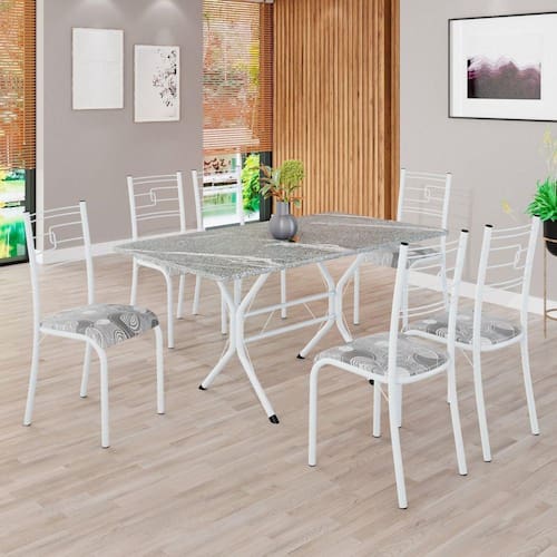 O Conjunto Sala de Jantar Paraty é uma ótima escolha para quem busca combinar estilo e praticidade. Este conjunto apresenta uma mesa retangular com um design elegante e moderno, acompanhada por seis cadeiras. A mesa tem uma estrutura em aço, que oferece estabilidade ao conjunto. O tampo em pedra granito topázio apresenta uma estética sofisticada e acolhedora. A tonalidade topázio adiciona calor e elegância ao ambiente, enquanto a pedra granito oferece durabilidade e resistência a riscos e manchas. Essa combinação de cores naturais e resistência prática resulta em um visual clássico e funcional, tornando o tampo em pedra granito topázio uma ótima escolha para aprimorar sua sala de jantar. Medida da Mesa (A x L x P): 75,8 cm x 140 cm x 75 cm Peso da Mesa: 60,2 kg Mesa suporta até: 15.0000 Acabamento da Cadeira/Banco: Pintura Texturizada Acabamento da Mesa: Polido Ambiente Principal: Sala de Jantar Cadeira/Banco estofada: Somente Assento Estofado Cadeira/Banco Estofada: Somente Assento Estofado Cadeira/Banco suporta até: 120.0000 codigo_ean: 7909903588895 Complexidade da Montagem: Média: pode ser montado por mais de uma pessoa e/ou necessite de maior conhecimento para montagem Cor: Paraopeba / Branco Cor do Produto: Paraopeba / Branco De Canto (Canto Alemão): Não Escala de Brilho: Semi-Fosco Espessura do Tampo: 18 mm Formato do Tampo: Retangular Itens Inclusos: 1 MESA, 6 CADEIRAS, MANUAL DE MONTAGEM E FERRAGENS. Manual de Montagem e Instalação: https://product-hub-prd.madeiramadeira.com.br/894025/documents/3c682068-80e2-4d87-9265-eef92c0dc177800365cjparatybasecabofrio.pdf Material da Base da Mesa: Aço Material da Estrutura da Cadeira: Aço Material do Tampo: Granito Medida da Cadeira/Banco (A x L x P): 90 cm x 36,4 cm x 46 cm Medida do Tampo (L x C x E): 75 cm x 140 cm x 1,8 cm Mesa Extensível: Não Necessita Montagem: Sim Origem do Produto: Nacional Peso da Cadeira/Banco: 2,38 kg Possui Apoio Para os Pés: Não Quantidade de Cadeiras: 6 Quantidade de Lugares: 06 Recomendações de Uso, Manutenção e Limpeza: Usar um pano de tecido macio e seco, evitar detergentes, alvejantes e produtos químicos de limpeza; no tampo usar tecido macio levemente umedecido. Sistema de Montagem: PARAFUSOS
