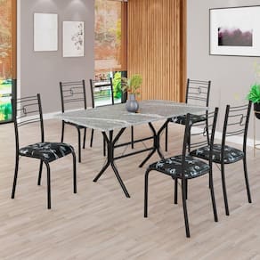 O Conjunto Sala de Jantar Paraty é uma ótima escolha para quem busca combinar estilo e praticidade. Este conjunto apresenta uma mesa retangular com um design elegante e moderno, acompanhada por seis cadeiras. A mesa tem uma estrutura em aço, que oferece estabilidade ao conjunto. O tampo em pedra granito topázio apresenta uma estética sofisticada e acolhedora. A tonalidade topázio adiciona calor e elegância ao ambiente, enquanto a pedra granito oferece durabilidade e resistência a riscos e manchas. Essa combinação de cores naturais e resistência prática resulta em um visual clássico e funcional, tornando o tampo em pedra granito topázio uma ótima escolha para aprimorar sua sala de jantar. Medida da Mesa (A x L x P): 75,8 cm x 140 cm x 75 cm Peso da Mesa: 60,2 kg Mesa suporta até: 15.0000 Acabamento da Cadeira/Banco: Pintura Texturizada Acabamento da Mesa: Polido Ambiente Principal: Sala de Jantar Cadeira/Banco estofada: Somente Assento Estofado Cadeira/Banco Estofada: Somente Assento Estofado Cadeira/Banco suporta até: 120.0000 codigo_ean: 7909903588796 Complexidade da Montagem: Média: pode ser montado por mais de uma pessoa e/ou necessite de maior conhecimento para montagem Cor: Preto Floral / Preto Fosco Cor do Produto: Preto Floral / Preto Fosco De Canto (Canto Alemão): Não Escala de Brilho: Semi-Fosco Espessura do Tampo: 18 mm Formato do Tampo: Retangular Itens Inclusos: 1 MESA, 6 CADEIRAS, MANUAL DE MONTAGEM E FERRAGENS. Manual de Montagem e Instalação: https://product-hub-prd.madeiramadeira.com.br/894009/documents/3f78dae0-dbf3-4527-83a1-8587ae619a6b800365cjparatybasecabofrio.pdf Material da Base da Mesa: Aço Material da Estrutura da Cadeira: Aço Material do Tampo: Granito Medida da Cadeira/Banco (A x L x P): 90 cm x 36,4 cm x 46 cm Medida do Tampo (L x C x E): 75 cm x 140 cm x 1,8 cm Mesa Extensível: Não Necessita Montagem: Sim Origem do Produto: Nacional Peso da Cadeira/Banco: 2,38 kg Possui Apoio Para os Pés: Não Quantidade de Cadeiras: 6 Quantidade de Lugares: 06 Recomendações de Uso, Manutenção e Limpeza: Usar um pano de tecido macio e seco, evitar detergentes, alvejantes e produtos químicos de limpeza; no tampo usar tecido macio levemente umedecido. Sistema de Montagem: PARAFUSOS