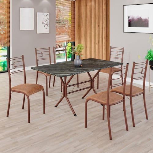 O Conjunto Sala de Jantar Paraty é uma ótima escolha para quem busca combinar estilo e praticidade. Este conjunto apresenta uma mesa retangular com um design elegante e moderno, acompanhada por seis cadeiras. A mesa tem uma estrutura em aço, que oferece estabilidade ao conjunto. O tampo em madeira MDP ardósia indiana apresenta uma estética sofisticada e acolhedora. A tonalidade ardósia indiana adiciona calor e elegância ao ambiente, enquanto a madeira MDP oferece durabilidade e resistência a riscos e manchas. Essa combinação de cores naturais e resistência prática resulta em um visual clássico e funcional, tornando o tampo em madeira MDP off white uma ótima escolha para aprimorar sua sala de jantar. Medida da Mesa (A x L x P): 75,5 cm x 140 cm x 75 cm Peso da Mesa: 13,72 kg Mesa suporta até: 15.0000 Acabamento da Cadeira/Banco: Pintura Texturizada Ambiente Principal: Sala de Jantar Cadeira/Banco Estofada: Somente Assento Estofado Cadeira/Banco estofada: Somente Assento Estofado Cadeira/Banco suporta até: 120.0000 codigo_ean: 7909903589854 Complexidade da Montagem: Média: pode ser montado por mais de uma pessoa e/ou necessite de maior conhecimento para montagem Cor: C. Marrom / Marrom Cor do Produto: C. Marrom / Marrom De Canto (Canto Alemão): Não Escala de Brilho: Semi-Fosco Espessura do Tampo: 18 mm Formato do Tampo: Retangular Itens Inclusos: 1 mesa, 6 cadeiras, manual de montagem e ferragens. Manual de Montagem e Instalação: https://product-hub-prd.madeiramadeira.com.br/894190/documents/1b54a987-67b9-4b58-bc27-b7d955207a77800365cjparatybasecabofrio.pdf Material da Base da Mesa: Aço Material da Estrutura da Cadeira: Aço Material do Tampo: MDP Medida da Cadeira/Banco (A x L x P): 90 cm x 36,4 cm x 46 cm Medida do Tampo (L x C x E): 75 cm x 140 cm x 1,5 cm Mesa Extensível: Não Necessita Montagem: Sim Origem do Produto: Nacional Peso da Cadeira/Banco: 2,38 kg Possui Apoio Para os Pés: Não Quantidade de Cadeiras: 6 Quantidade de Lugares: 06 Recomendações de Uso, Manutenção e Limpeza: Usar um pano de tecido macio e seco, evitar detergentes, alvejantes e produtos químicos de limpeza; no tampo usar tecido macio levemente umedecido. Sistema de Montagem: PARAFUSOS