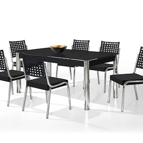 Conjunto com pés robusto de Aço Carbono CROMADO Polido de alto brilho, de design agradável. Mesa de design convencional, com travas de MDP-BP espessas, com sistemas de fixação que se encaixa perfeitamente e precisamente, a perfeita junção do aço com a madeira em uma mesa o vidro é serigrafado temperado para dar maior resistência e durabilidade. Cadeiras de design convencional e muito confortáveis, o diferencial estas em seu encosto com junco sintético com proteção U.V., o acabamento do trançado do junco da leveza e a transparência para o conjunto, assento reforçado em caixa, com revestimentos em suede, fixados com porcas garras. Produtos de montagem fácil e funcional. Medida da Mesa (A x L x P): 77x90x160 cm Peso da Mesa: 39,1 kg Mesa suporta até: 40.0000 Acabamento da Cadeira/Banco: Cromado Acabamento da Mesa: Cromado Acompanha Manual de Instalação: Sim Almofada do assento: Removível Altura do Conjunto: 90 cm Ambiente Principal: Sala de Jantar Cadeira/Banco Estofada: Somente Assento Estofado Cadeira/Banco estofada: Somente Assento Estofado Cadeira/Banco suporta até: 120.0000 codigo_ean: 7909903970805 Complexidade da Montagem: Baixa: pode ser montado por uma pessoa sozinha Cor: Cromado/Preto Cor do Produto: Cromado/Preto De Canto (Canto Alemão): Não Design da Base: 4 Pés Escala de Brilho: Brilhante Espessura do Tampo: 6 mm Espessura do Vidro: 6 mm Estrutura do Assento: MDF Formato do Tampo: Retangular Itens Inclusos: 1 Mesa, 6 Cadeiras, Kit Ferragens e Manual de Montagem Linha ou Coleção: NATANI Manual de Especificação Técnica: https://product-hub-prd.madeiramadeira.com.br/957978/documents/0130d581-b506-43c9-a825-541da06285102436095598517284803418545.pdf Manual de Montagem e Instalação: https://product-hub-prd.madeiramadeira.com.br/957978/documents/3072e336-e55b-43a4-a392-faacba98227a2436094598517284803389744.pdf Material da Base da Mesa: Aço Cromado Material da Estrutura da Cadeira: Aço Carbono Material do Tampo: Vidro Material Principal: Aço Carbono Cromado Material Principal das Cadeiras/Bancos: Aço Carbono Medida da Base (A x L x P): 76x88x158 cm Medida da Cadeira/Banco (A x L x P): 92x49x52 Medida do Tampo (L x C x E): 90x160x6 Mesa Dobrável: Não Mesa Extensível: Não Necessita Montagem: Sim Origem do Produto: Nacional Peso da Cadeira/Banco: 4,85 kg Possui Apoio para Braços: Não Possui Apoio Para os Pés: Não Possui Prateleiras: Não Possui Suporte Giratório: Não Possui Vidro: Sim Quantidade de Cadeiras: 6 Quantidade de Lugares: 06 Recomendações de Uso, Manutenção e Limpeza: Limpeza com pano macio e levemente umedecido. Não ultilizar solventes a base e de inflamáveis. Não utilizar produtos abrasivos. Sistema de Montagem: parafusos Tipo de Assento: Removível Tipo de Encosto: Solto Vidro Temperado: Sim