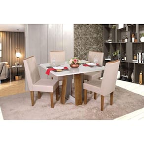 Produto com excelente acabamento em camadas UV (Ultra Violeta) , com vernizes e esmaltes anti-risco de alta resistência e impermeabilidade garantida. Acabamento final com textura em alto relevo. Cadeira com design diferenciado e muito confortável. Fácil montagem e resistência. Medida da Mesa (A x L x P): 79cmX94cmX115cm Peso da Mesa: 37,11 kg Mesa suporta até: 100.0000 Acabamento da Cadeira/Banco: Pintura UV Acabamento da Mesa: Pintura UV Acompanha Manual de Instalação: Sim Almofada do assento: Fixa Ambiente Principal: Sala de Jantar Cadeira/Banco estofada: Encosto e Assento Estofados Cadeira/Banco Estofada: Encosto e Assento Estofados Cadeira/Banco suporta até: 110.0000 codigo_ean: 7909903433294 Complexidade da Montagem: Baixa: pode ser montado por uma pessoa sozinha Cor: Freijó/Off White Cor do Produto: Freijó/Off White De Canto (Canto Alemão): Não Enchimento do Assento: Espuma D-23 Enchimento do Encosto: Espuma D-14 Escala de Brilho: Fosco Espessura do Tampo: 20 mm Estrutura do Encosto: MDF Formato do Tampo: Retangular Itens Inclusos: 1 Mesa, 4 Cadeiras, Kit Ferragem e Manual de Montagem Manual de Montagem e Instalação: https://product-hub-prd.madeiramadeira.com.br/871451/documents/8dc38795-4177-4e95-82ce-b56e018c558f1539769mesalaiscadhelena.pdf Material da Base da Mesa: MDF Material da Estrutura da Cadeira: MDF Material do Tampo: Vidro/MDF Medida da Cadeira/Banco (A x L x P): 96cmX40cmX41cm Medida do Tampo (L x C x E): 94cmX115cmX24mm Mesa Dobrável: Não Mesa Extensível: Não Necessita Montagem: Sim Origem do Produto: Nacional Peso da Cadeira/Banco: 8 kg Possui Apoio para Braços: Não Possui Apoio Para os Pés: Não Possui Prateleiras: Não Possui Vidro: Sim Quantidade de Cadeiras: 4 Quantidade de Lugares: 04 Recomendações de Uso, Manutenção e Limpeza: Limpeza com pano macio e levemente umedecido. Não utilizar solventes a base de inflamáveis e não utilizar produtos abrasivos. Revestimento da Cadeira/Banco: Linho Sistema de Montagem: SIM Tipo de Assento: Fixo Tipo de Encosto: Fixo Ean: 7909903433294