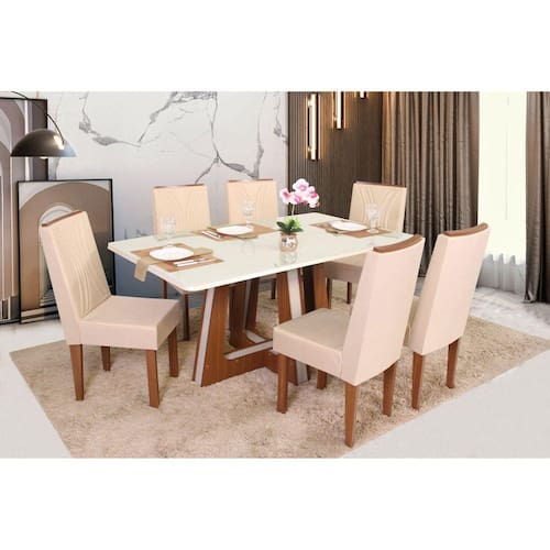 Produto com excelente acabamento em camadas UV (Ultra Violeta) , com vernizes e esmaltes anti-risco de alta resistência e impermeabilidade garantida. Acabamento final com textura em alto relevo. Cadeira com design diferenciado e muito confortável. Fácil montagem e resistência. Medida da Mesa (A x L x P): 158,5cmX94cmX79cm Peso da Mesa: 43,06 kg Mesa suporta até: 100.0000 Acabamento da Cadeira/Banco: Pintura UV Acabamento da Mesa: Pintura UV Acompanha Manual de Instalação: Sim Ambiente Principal: Sala de Jantar Cadeira/Banco Estofada: Encosto e Assento Estofados Cadeira/Banco estofada: Encosto e Assento Estofados Cadeira/Banco suporta até: 110.0000 codigo_ean: 7909903432136 Complexidade da Montagem: Baixa: pode ser montado por uma pessoa sozinha Cor: Marromlle/Off White Cor do Produto: Marromlle/Off White De Canto (Canto Alemão): Não Enchimento do Assento: Espuma D-23 Enchimento do Encosto: Espuma D-14 Escala de Brilho: Fosco Espessura do Tampo: 20 mm Estrutura do Encosto: MDF Formato do Tampo: Retangular Itens Inclusos: 1 Mesa, 6 Cadeiras, Kit Ferragem e Manual de Montagem Manual de Especificação Técnica: https://product-hub-prd.madeiramadeira.com.br/870635/documents/1397007b-4263-469a-9575-aef725e5678056cadeirashelenaitAlia2022.pdf Manual de Montagem e Instalação: https://product-hub-prd.madeiramadeira.com.br/870635/documents/f8b56609-6ab7-4125-8b0c-80daf54474a5538697conjvitOriacadhelena.pdf Material da Base da Mesa: MDF Material da Estrutura da Cadeira: MDF Material do Tampo: Vidro/MDF Medida da Base (A x L x P): 1 Medida da Cadeira/Banco (A x L x P): 96cmX40cmX41cm Medida do Tampo (L x C x E): 94cmX158,5cmX24cm Mesa Extensível: Não Necessita Montagem: Sim Origem do Produto: Nacional Peso da Cadeira/Banco: 8 kg Possui Apoio para Braços: Não Possui Apoio Para os Pés: Não Possui Prateleiras: Não Possui Vidro: Sim Quantidade de Cadeiras: 6 Quantidade de Lugares: 06 Recomendações de Uso, Manutenção e Limpeza: Limpeza com pano macio e levemente umedecido. Não utilizar solventes a base de inflamáveis e não utilizar produtos abrasivos. Revestimento da Cadeira/Banco: Linho Sistema de Montagem: SIM Tipo de Assento: Fixo Ean: 7909903432136