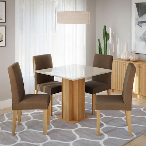 A Sala de Jantar Sophia 95x95 com 4 Cadeiras Maia é ideal para reunir a família em momentos agradáveis e descontraídos. A mesa Sophia possui tampo em MDF/vidro com bordas chanfradas e acabamento em laca, oferecendo sofisticação e durabilidade. As cadeiras Maia complementam o conjunto com estrutura em MDF, pintura UV e estofamento de alta densidade, garantindo conforto e estilo. Com design inovador e moderno, a Cimol busca trazer elegância e funcionalidade para o seu ambiente.