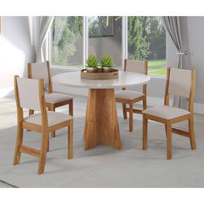 Caracteristicas: 4 Cadeiras Acabamento em pintura UV, semi-brilho Assento espuma D26 Cadeira suporta ate 80kg Encosto espuma D12 Estrutura em MDP/MDF Mesa redonda Mesa suporta ate 50kg Revestimento em tecido Linho Tampo pintado em MDF 25mm